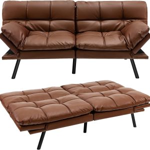 COSTWAY 2 Seater Convertible Sofa Bed, Click Clack Sleeper Couch with Reclining Backrest, Adjustable Armrests & 6 Metal Legs, Padded Loveseat Sofa for Living Room and Bedroom (PU Leather, Brown)