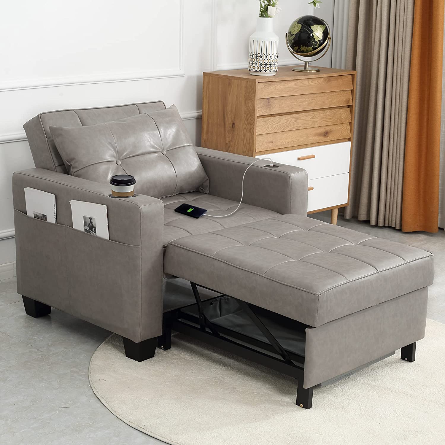DURASPACE Sleeper Chair 3-in-1 Convertible Chair Bed Pull Out Sleeper Chair Beds Adjustable Single Armchair Sofa Bed with USB Ports, Side Pocket, Cup Holder for Small Space (Gray)