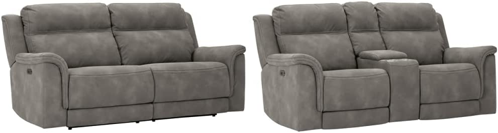 Signature Design by Ashley Erlangen Faux Leather Power Recliner with Adjustable Headrest & USB Charging Port, Gray & Erlangen Faux Leather Power Reclining Loveseat with Console, Gray