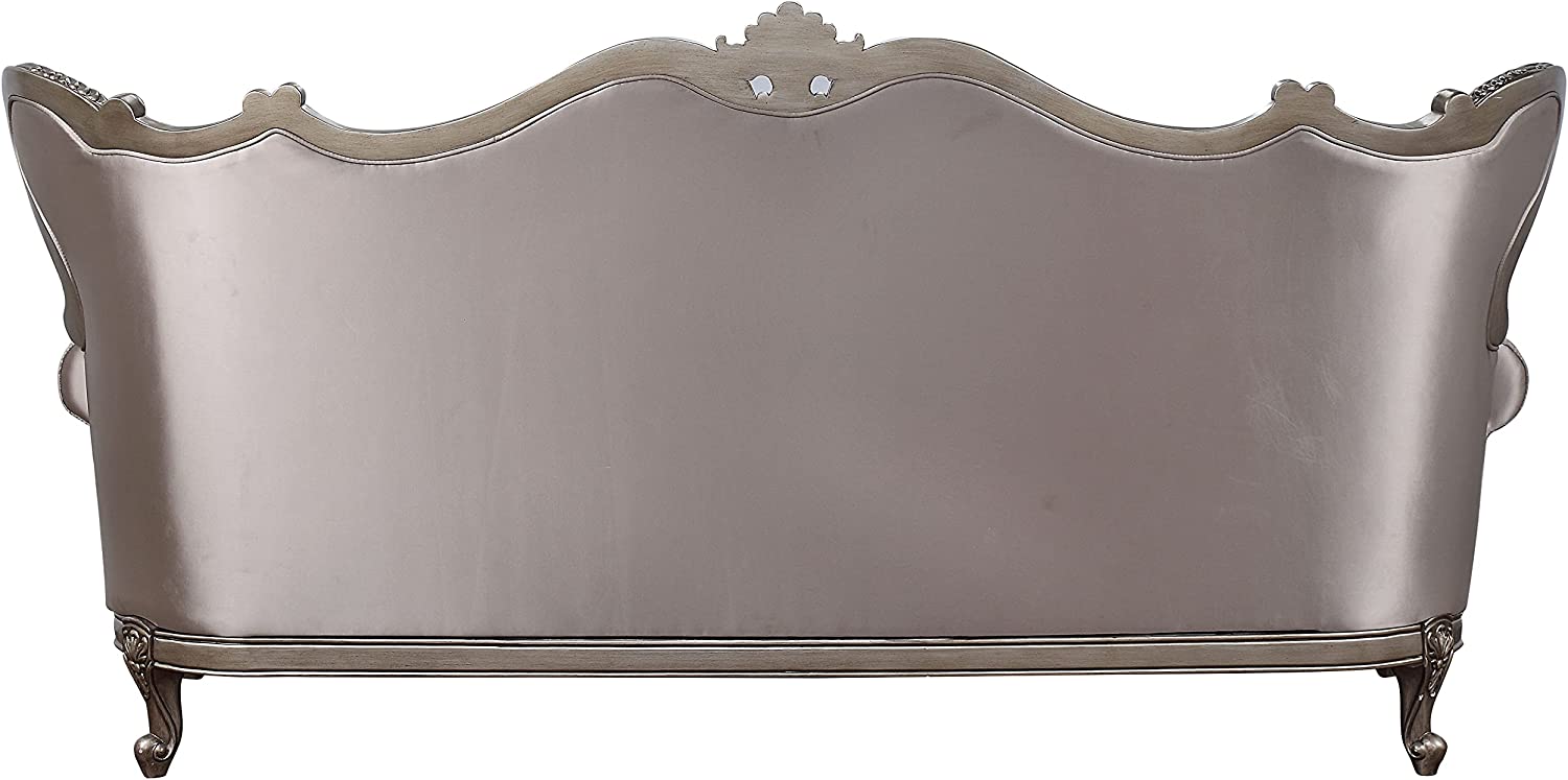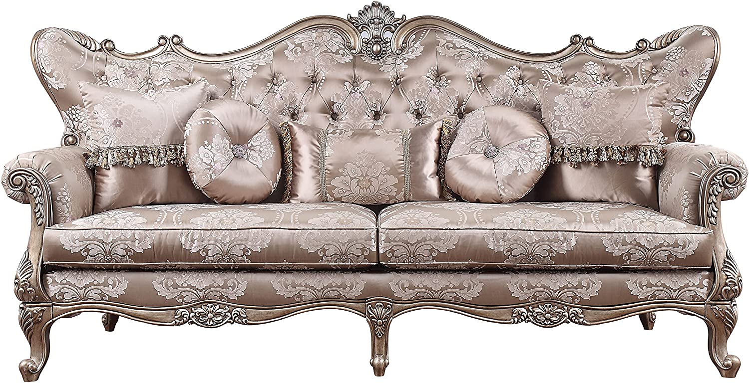 The sofa is gorgeous, with shimmery fabric upholstery that highlights the champagne finish of the wooden frame. Button-tufted seatbacks wing out under carved arches. Loose seat cushions are upholstered in a floral patterned fabric that extends over rolled arms. A scrolled floral motif adorns the piece in this addition to the exclusive design collection.
