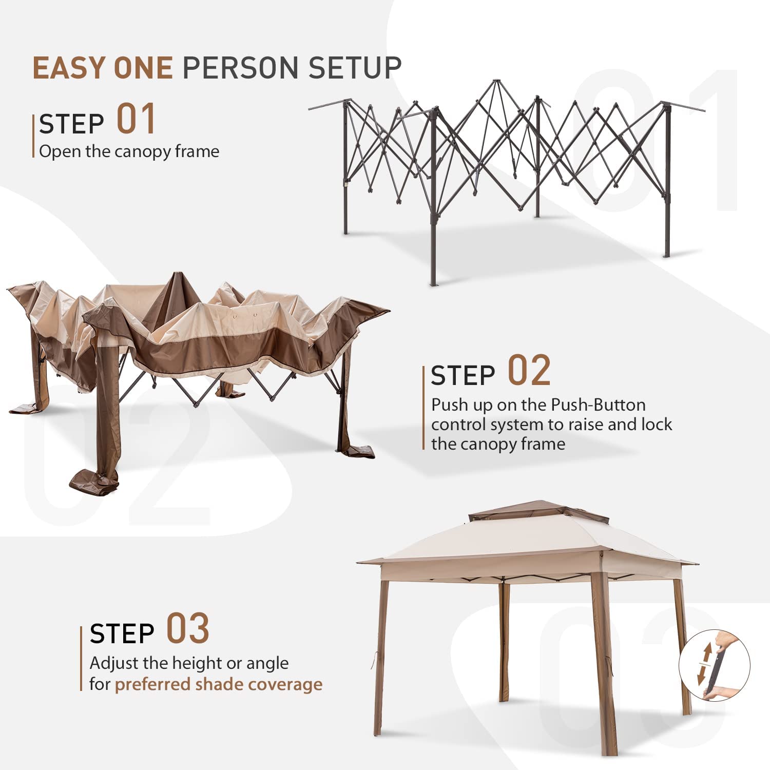 COOL Spot is a premier pop-up gazebo and gazebo brand that delivers innovative product with ease-of-use, combined with premium design aesthetics. COOL Spot is vertically integrated and one of the largest pop-up gazebo manufacturers in the world. We invest in our product testing and product innovation laboratory to ensure that our product meets and exceeds industry quality standards and requirements. We are relentless in our efforts to innovate new ways to bring you safe, hassle-free, quality products. Our International & North American Product Development and Design teams work tirelessly to improve upon the status quo and deliver better looking and better functioning products to you. Multi-use: School events/ weekend music festivals/ camping excursions/ tailgate parties/ backyard parties/ outdoor sporting events/ beach, lake, river trips and more! Set-Up: Simply extend the steel frame, place skylights on top, attach the canopy top, push up on the COOL Spot push-button control system to lock the frame, extend the legs (about 2/3 position), attach the sidewalls. Sets up in minutes. Product Dimensions: Walk-in height: 75.12 INCH Peak height: 116.40 INCH Rolling carry bag: 51.18 x 8.85 x 8.85 inches Package Dimensions: 52.76 x 9.45 x 9.45 inches Item Weight: 36.66 LBS Shipping weight: 39.42 LBS Package Include: 11′ x 11′ Pop up canopy Frame 11′ x 11′ Canopy Top Cover 1pc/brown ctn 12 pcs Stake 4pcs Rope 2pcs Netting Rope Carry bag 4pcs Netting 32pcs Ring