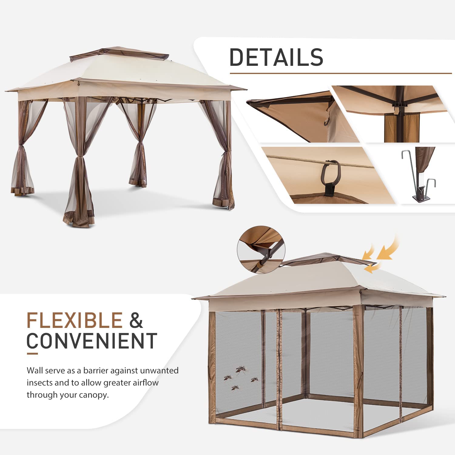 - MULTIPLE SIDE WALLS: COOL Spot Gazebo features zippered mesh sidewalls. You will be protected from the sun and rain as well as flying insects thanks to the high-quality mesh walls. Enjoy the great outdoors with ease from your private gazebo, while still having full airflow and visibility provided by these mesh sidewalls.