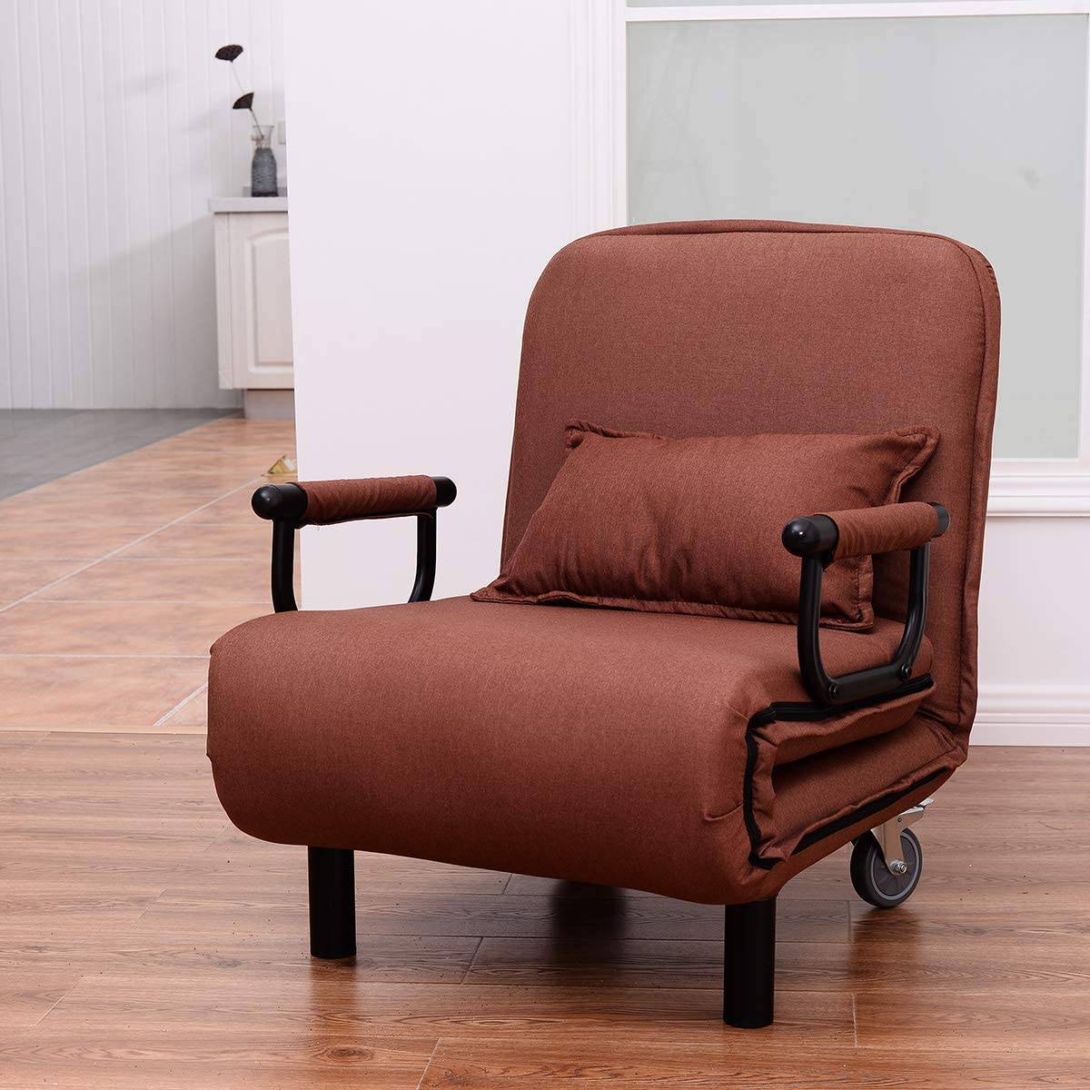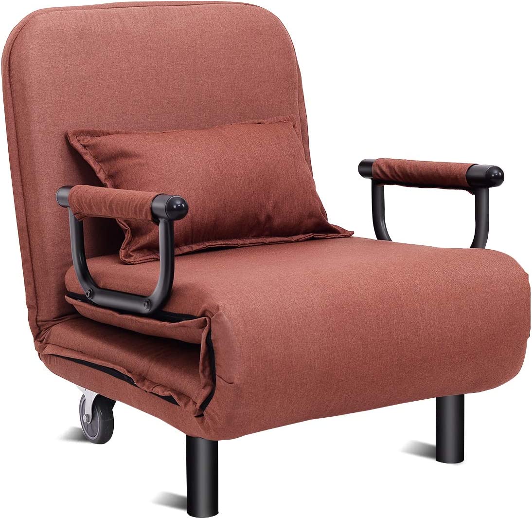 COSTWAY Single Folding Sofa Bed Chair Modern Fabric Sleep Function Holder W/Pillow & Wheel for Home Bedroom Living Room Office Indoor (Coffee)