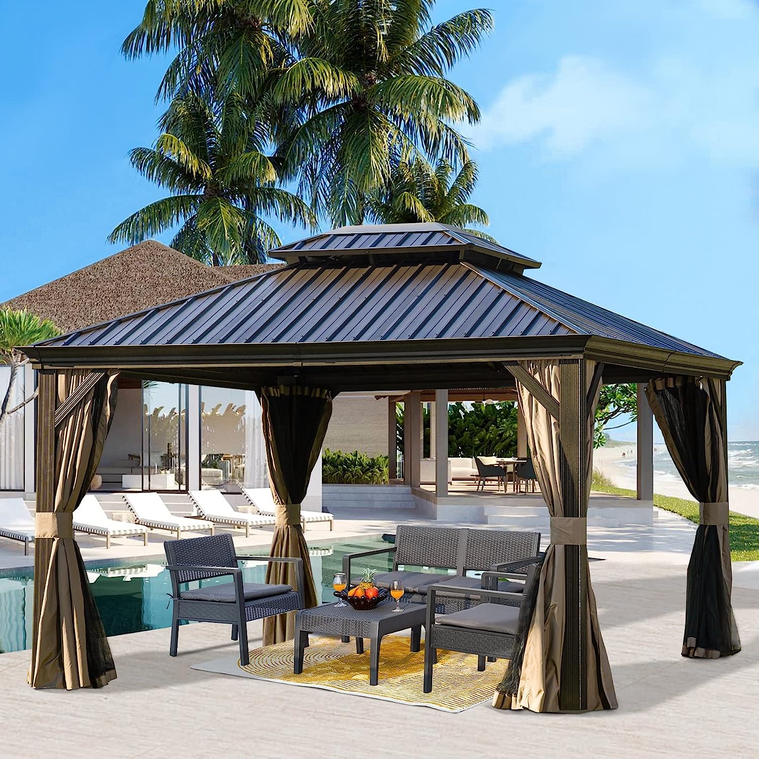 Domi Outdoor Living 10’ X 12’ Hardtop Gazebo Outdoor Aluminum Gazebo with Galvanized Steel Double Roof for Lawn and Garden, with Curtains & Net (Brown)