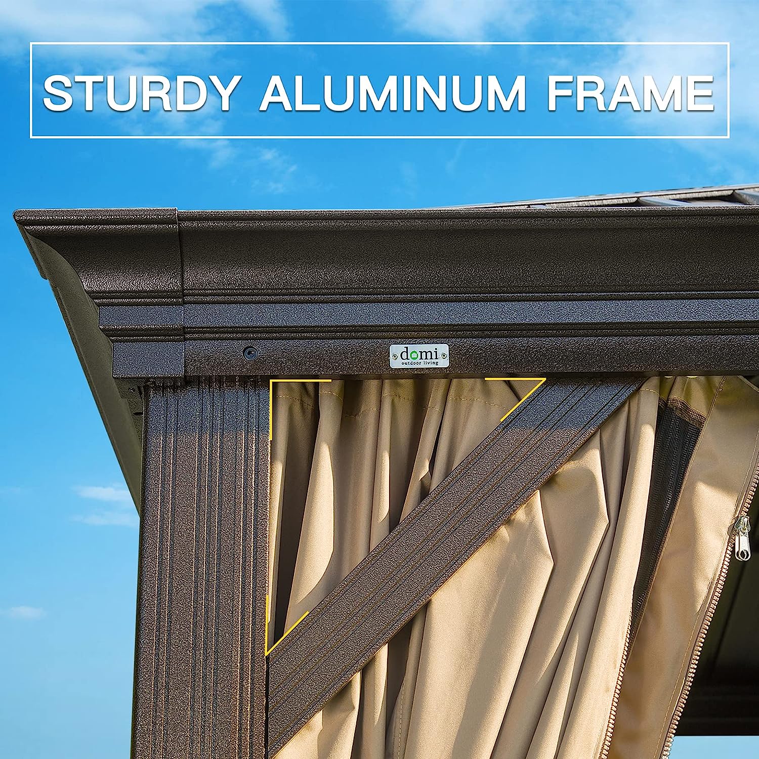 • 🌞【STURDY ALUMINUM FRAME】The gazebos for patios feature a strong powder coated dark brown aluminum frame,resistant to fading, rust and corrosion.Comes with pre-drilled base for each post.We suggest use expansion screws to make the whole system much more stable.4 corners adopt triangular stable design reinforced for years durability and safety.