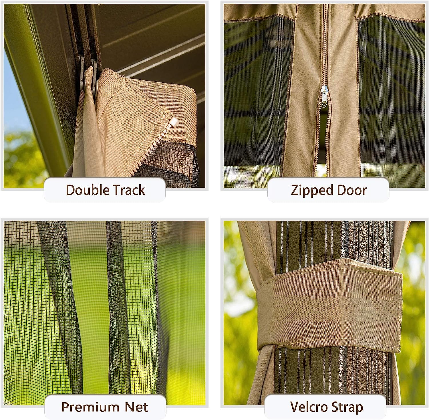 • 🌞【INCLUDE BUGS NETTING & PRIVACY CURTAINS】The hardtop gazebo designed with double-track system and double-sided zipper for quick sliding.The bugs netting maintain good ventilation and open view and the privacy curtains provide a safe and comfortable space for your family and children,it can also keeps the space warm.