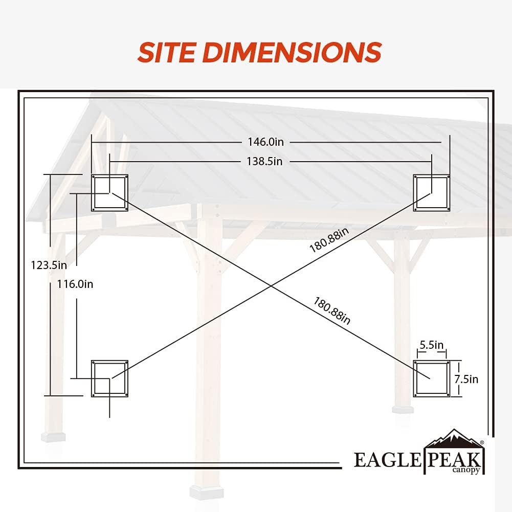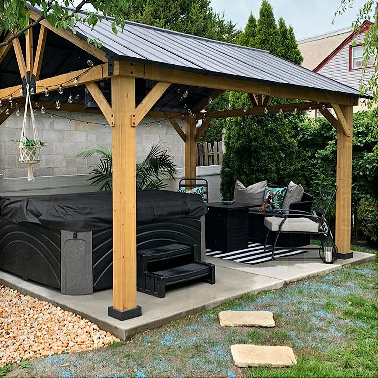 - BROAD USE: Eagle Peak wood gazebo is premium cedar wood frame construction with powder coated steel hardtop. It is great for backyard deck, lawn, outdoor patio, or near a pool, perfect for commercial or recreational use. The top measures 11 x 13 ft.