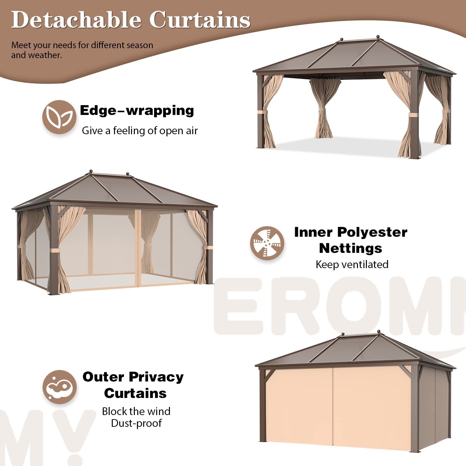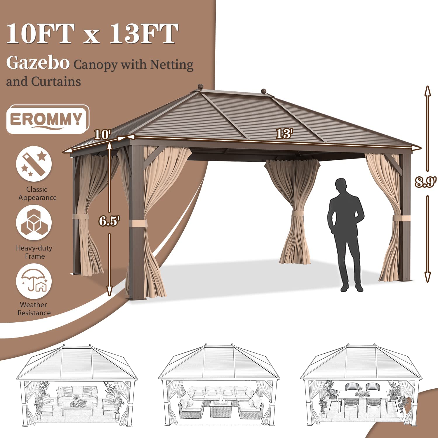 EROMMY 10' x 13' Gazebo, Galvanized Steel Hardtop Outdoor Aluminum Canopy with Netting and Shaded Curtains, Single Roof Permanent Metal Pavilion for Patio Backyard Deck