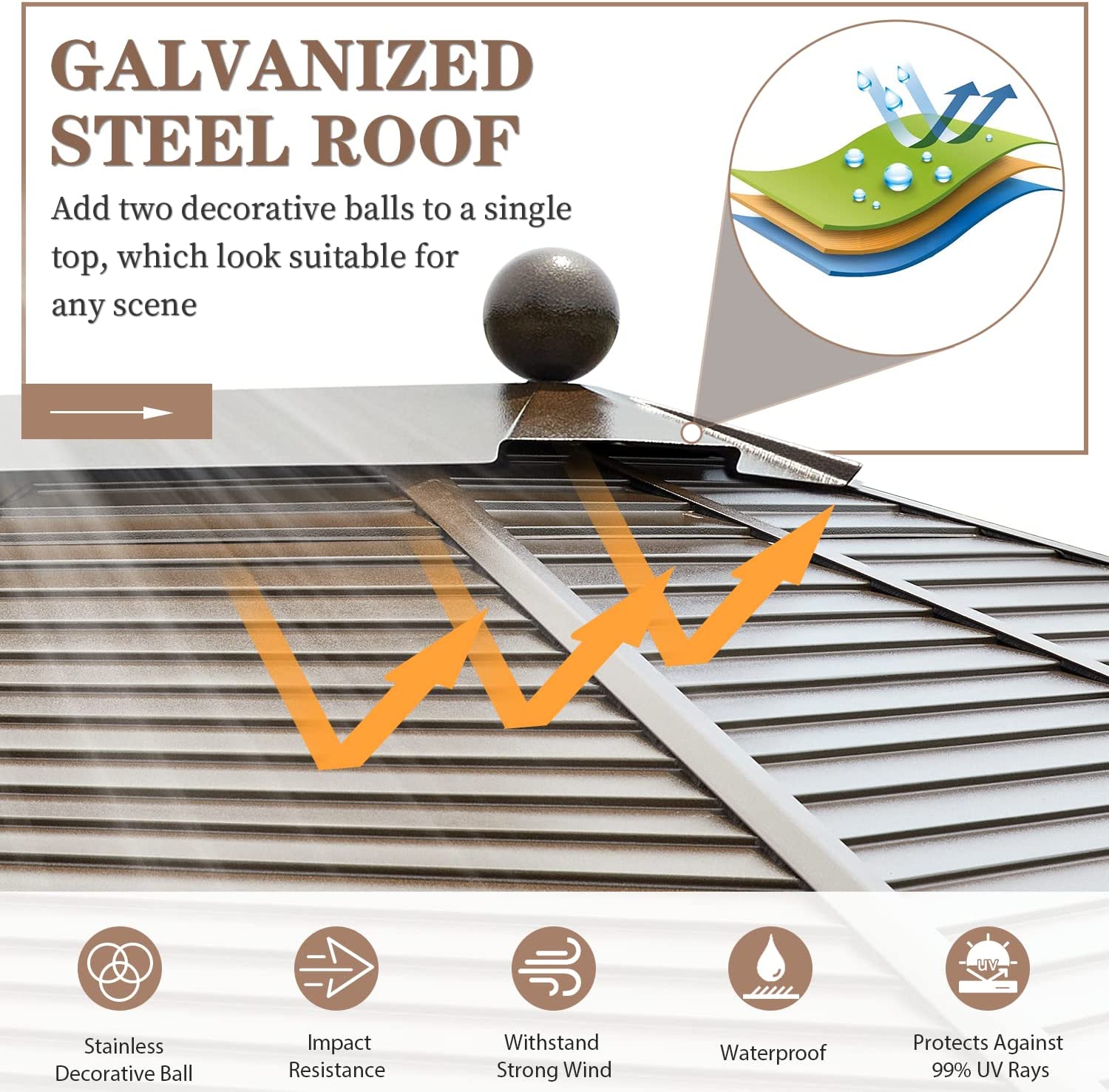 • 【GALVANIZED STEEL ROOF】Our Galvanized steel hardtop gazebo is stronger and more durable than fabric and polycarbonate material, it can withhold heavy snow and wind, aslo can keep out bright light and harmful UV rays. Rainwater will fall from the eaves and not collect on top, reducing the trouble of the rainy season.