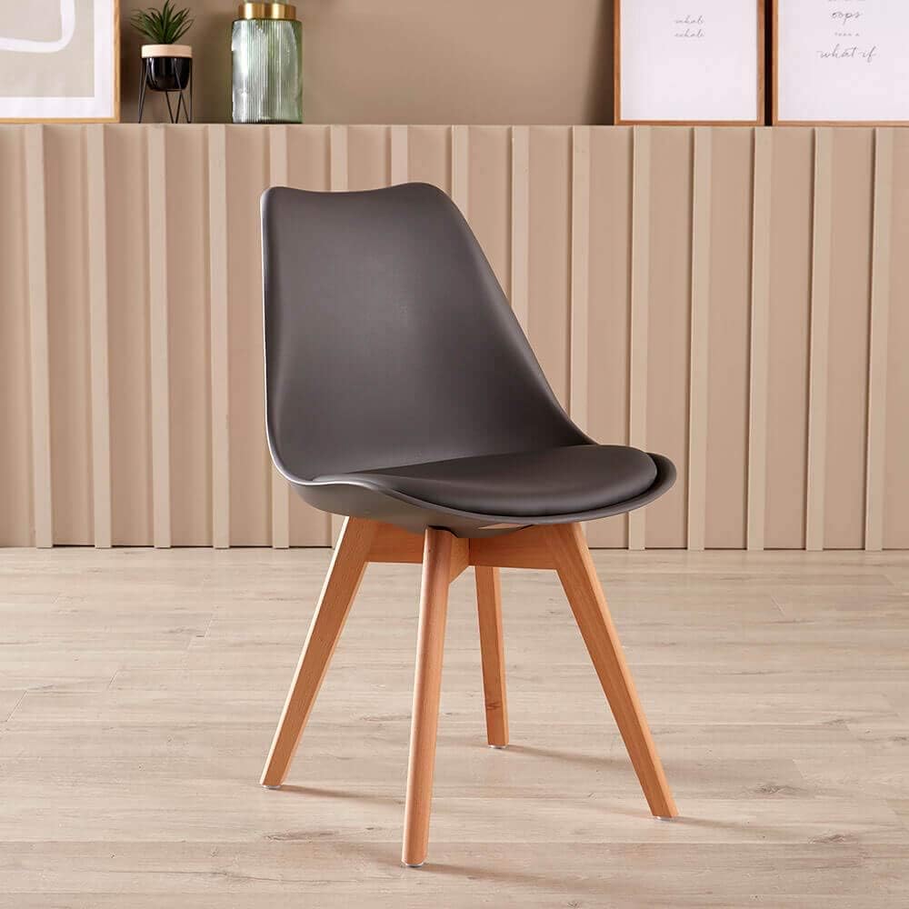 Add a contemporary feel to your home with this Braga Table 1.2m in white. Ideal for any dining room, the wooden table top is glossed with matt lacquer and is easily wiped over after use. The sturdy round shaped legs and metal frame ensure the table is robust and secure. This table is a modern and chic addition to any home. Accompanied with either 4 or 6 Lisbon Tulip Chairs in Grey. An upgrade for your seating area, this chair is available in grey. The four wooden legs are sturdy and the seat is cushioned with foam for extra comfort. Modern in design, this will go with any household interior. Easily assembled at home, this chair is supplied flat packed. Table Size = (W) 120cm (D) 80cm (H) 74cm Chair Size = (W) 56cm (D) 47cm (H) 82cm
