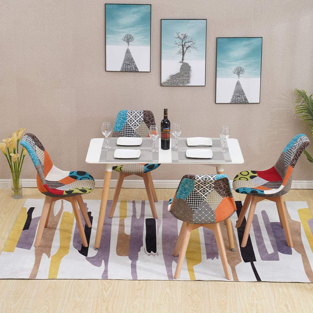 HomJoy Modern Dining Table and 4 Chairs Set, it’s designed to fit modern home decor requirements, light-weighted and easy to move around, best solution for small places need space saving. Soft padded cushion seat covered with multicoloured patchwork fabric, ultra comfy for long time sitting. Both table legs and chair legs are made of solid wood, which ensures stability and durability. It’s really attractive and can be placed anywhere in home / office / restaurant. Wonderful present for your family and friends. So come and choose it! Product Specifications: Style: ContemporaryColour: Table: White, Chair: Multicoloured Table Material: MDF Top, Metal Frame, Solid Wood LegsChair Material: Fabric Seat, Plastic, Solid Wood LegsTable Dimensions(LxWxH): 120 x 80 x 75 cm Chair Dimensions(LxWxH): 54 x 48 x 83 cmFeatures: Stylish Looking, Soft Padded Seat, Strong & Sturdy Usage: Dining Room, Lounge, Office, Restaurant, Commerical Package Included:- 1 Table- 4 Chairs- All Fittings- Instructions Notice: 1. Please be aware that we can not ship to Scottish Highlands, Scottish Islands, Isle of Man, Isle of Wight, Northern Ireland, Scilly Isles, Channel Islands or any offshore islands. 2. We provide fast and free delivery, our couriers have a success rate of 99% with delivery time scales therefore delays are rare. All of our orders will be delivered within 2-3 working days, if you haven’t receive your parcel on the proper time, please contact us. 3. If you have any questions, please feel free to contact us, we will respond to all emails as soon as possible. 4. At HomJoy, we offer premium home and office products at affordable price. We believe good quality can save your time and money. Our goal is to keep up with customer’s expectations for value and service to ease your life. Welcome to our store to select matching product for your home decoration.