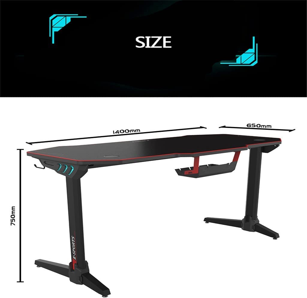 【LARGE GAMING SURFACE】 – The gaming desk has a wide 55 inch carbon fiber textured desktop with plenty of surface for your computer monitors, gaming keyboard, and other gaming gear. Measure: 55.1”L × 25.6” W × 29.5” H, can bearing up to 330lbs for up to 3 monitors.【Muti-functional Gaming Desk】 – Th gaming table comes with cup holder, headphone hook and cable management. Extra large gaming pad, XTRA LARGE GAMING PAD anti-skid gaming mouse pad effectively keep the keyboard and mouse from sliding, protect your desk from scratched and provide a better gaming experience.【Sturdy & Steady Construction】 – T-shaped design and four adjustable feet to make sure the desk to keep horizontal. Premium density fiberboard and coated steel tube frame which features high durability. We divide the desktop into two sections to make the desk easy to transport and fit requirements for stability and steady.Specification:Color: Luxury BlackMaterial: High Density Fiberboard Carbon Fiber Desktop Coated Steel Tube FrameOverall Dimension:55.1”L × 25.6” W × 29.5” HDesktop Dimension:55.1”L × 25.6” WWeight : 54.6lbsMax Capacity :330lbsPackage Included:1 x Office Gaming Desk1 x Headphone Hook1 x Gaming Mouse pad1 x Cup Holder1x Installation tool & InstructionAttention:Please loosen all the screws first, especially the joints of the desktop, and then gently tap the desktop to make it flat. When every part is normal, then tighten all the screws.
