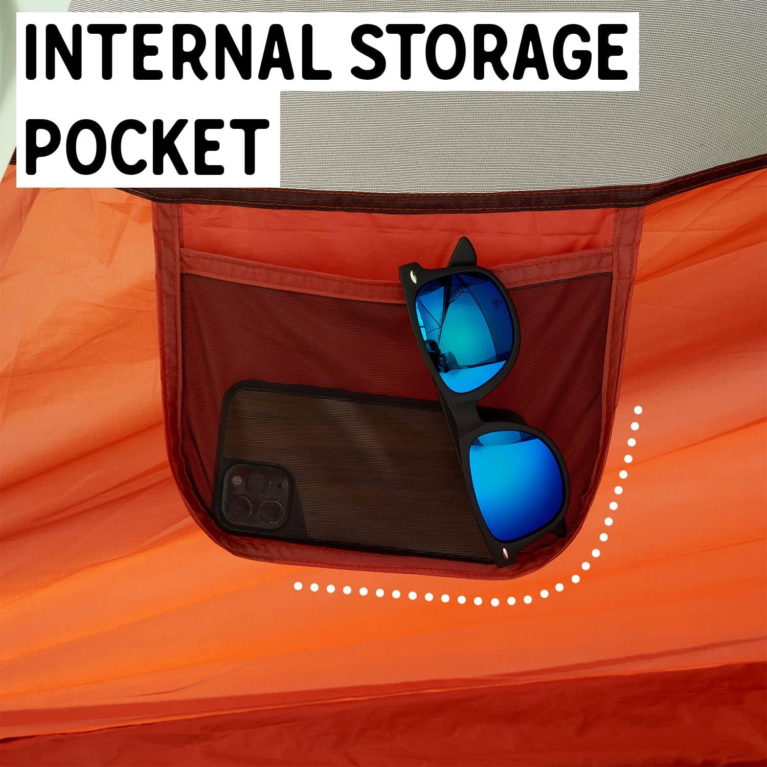 • BACKPACKING WITH COMFORT: 58-68 inch peak heights, 14 square feet per camper gear storage, single large D-door, double stake entry, pre-attached guylines, and internal storage pockets for tunes, cards, and goodies (leave the phones at home)