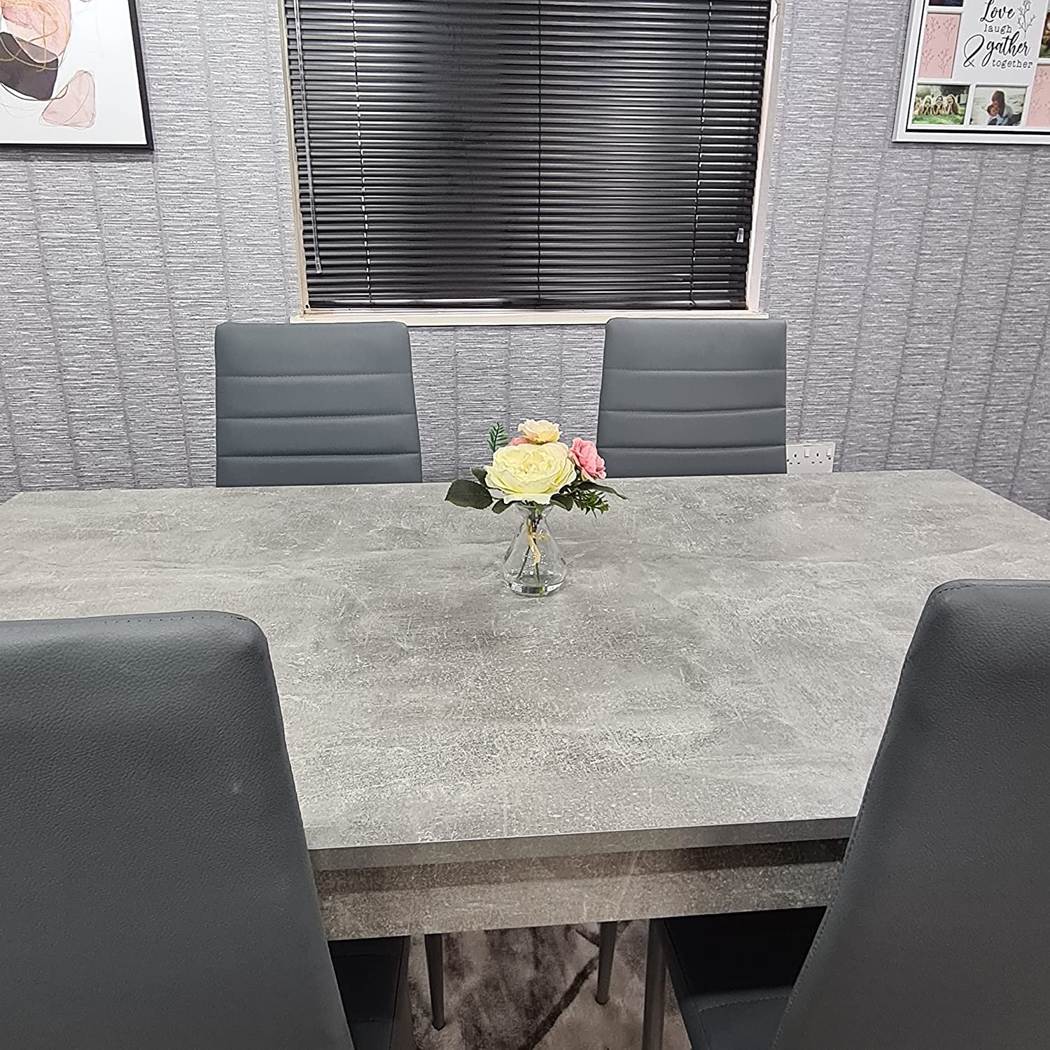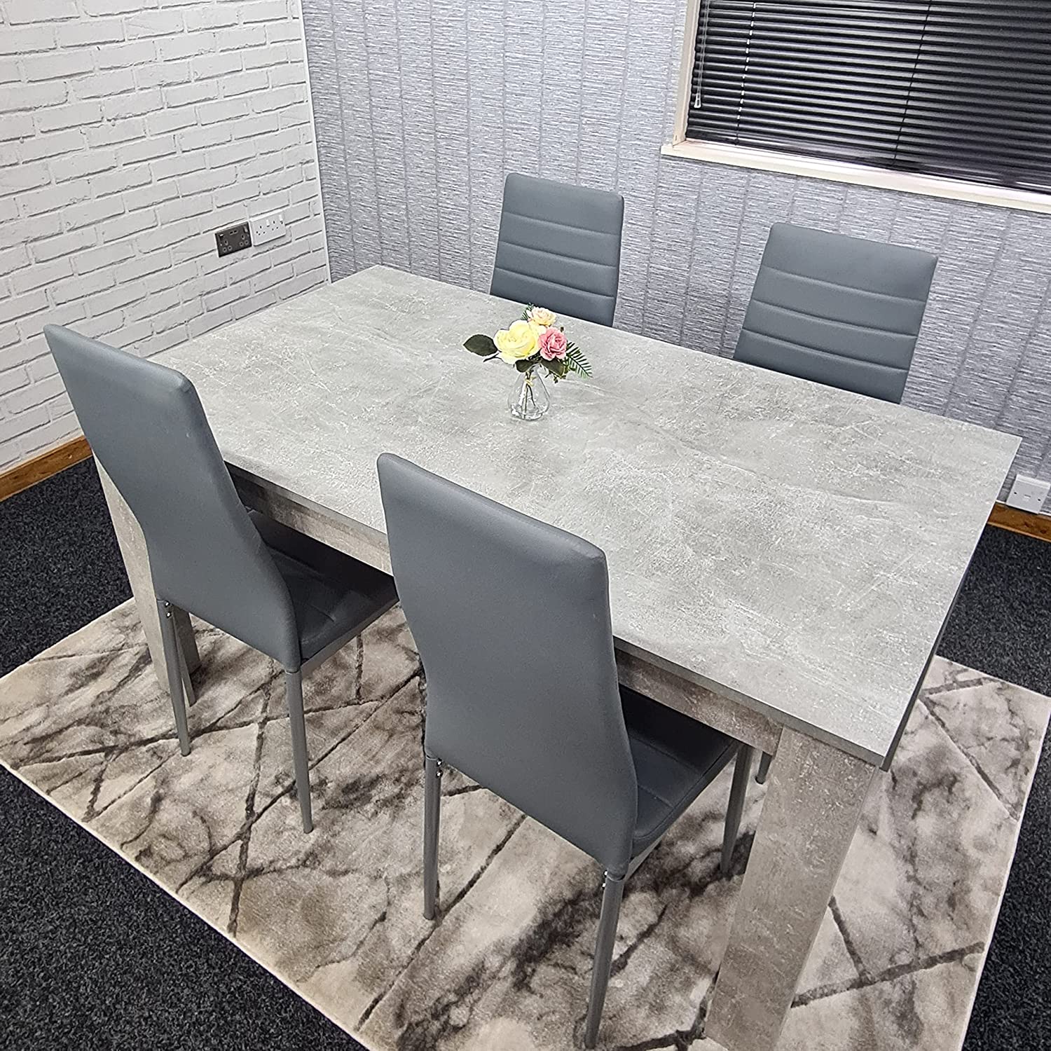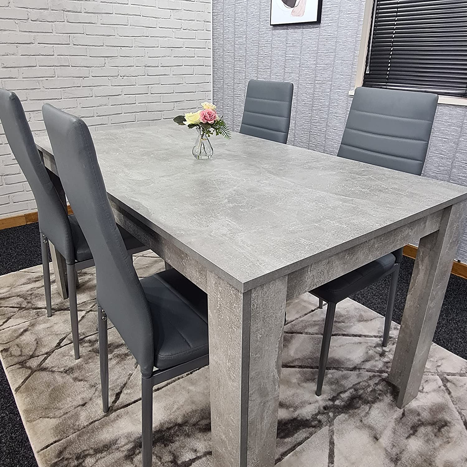 - Stone grey effect dining table with 4 grey metal chairs
