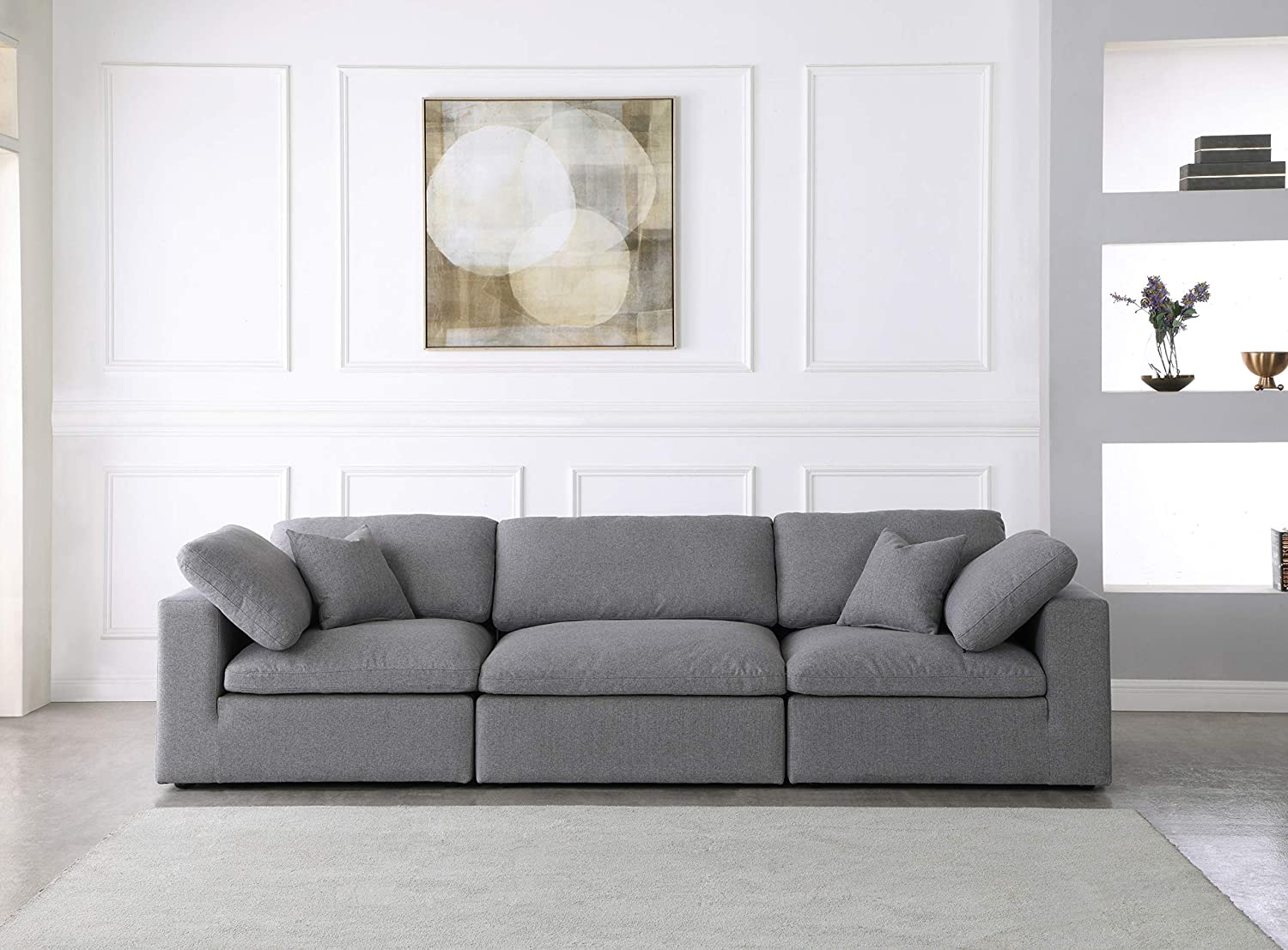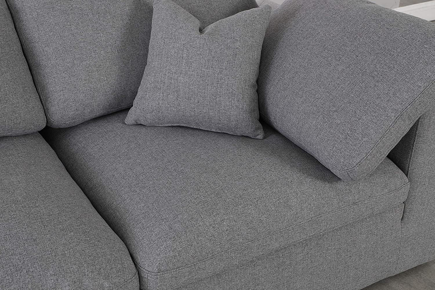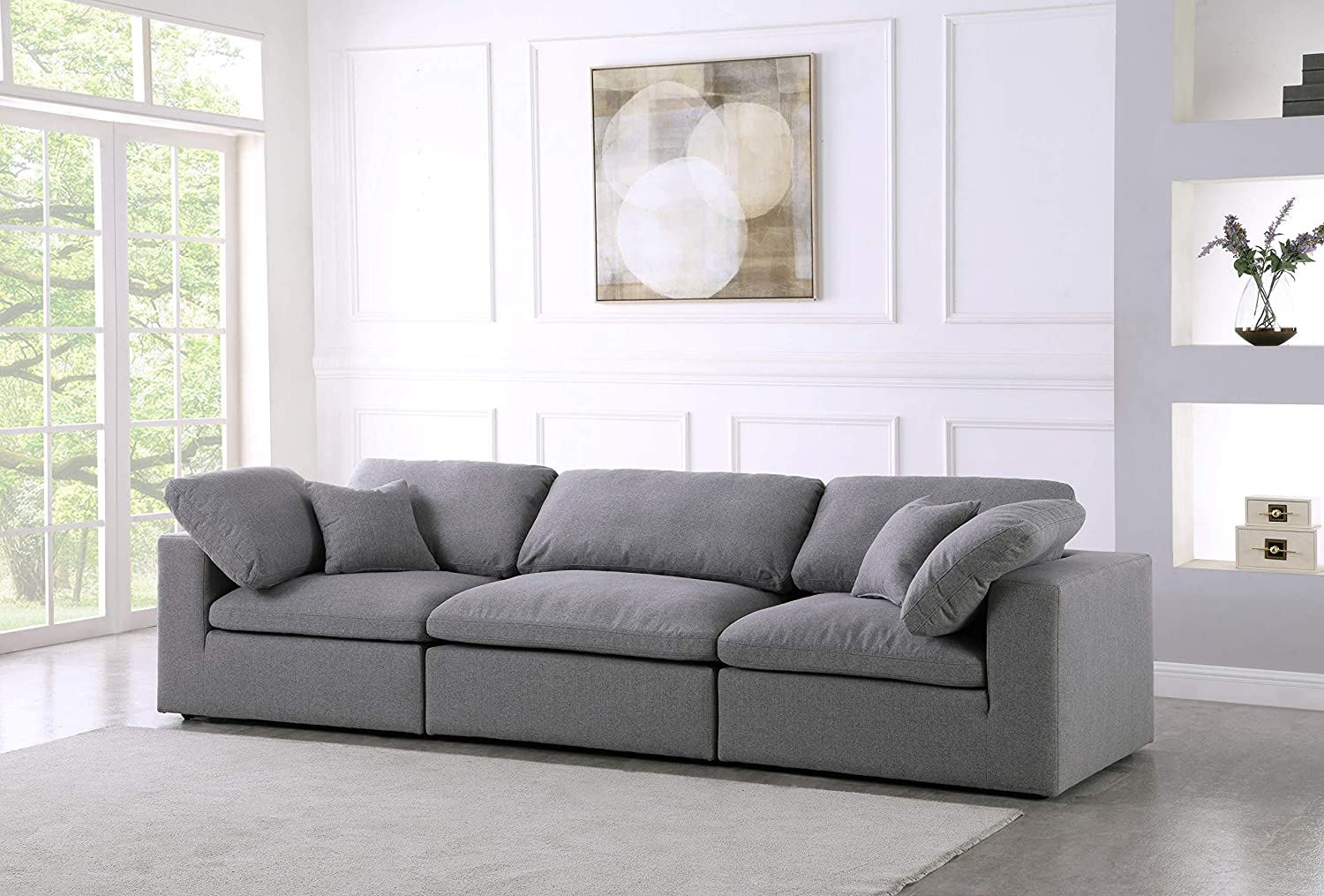 Meridian Furniture Serene Collection Modern | Contemporary Deluxe Cloud-Like Comfort Modular Sofa, Soft Linen Textured Fabric, Down Cushions, 2 Corner + 1 Armless, Grey