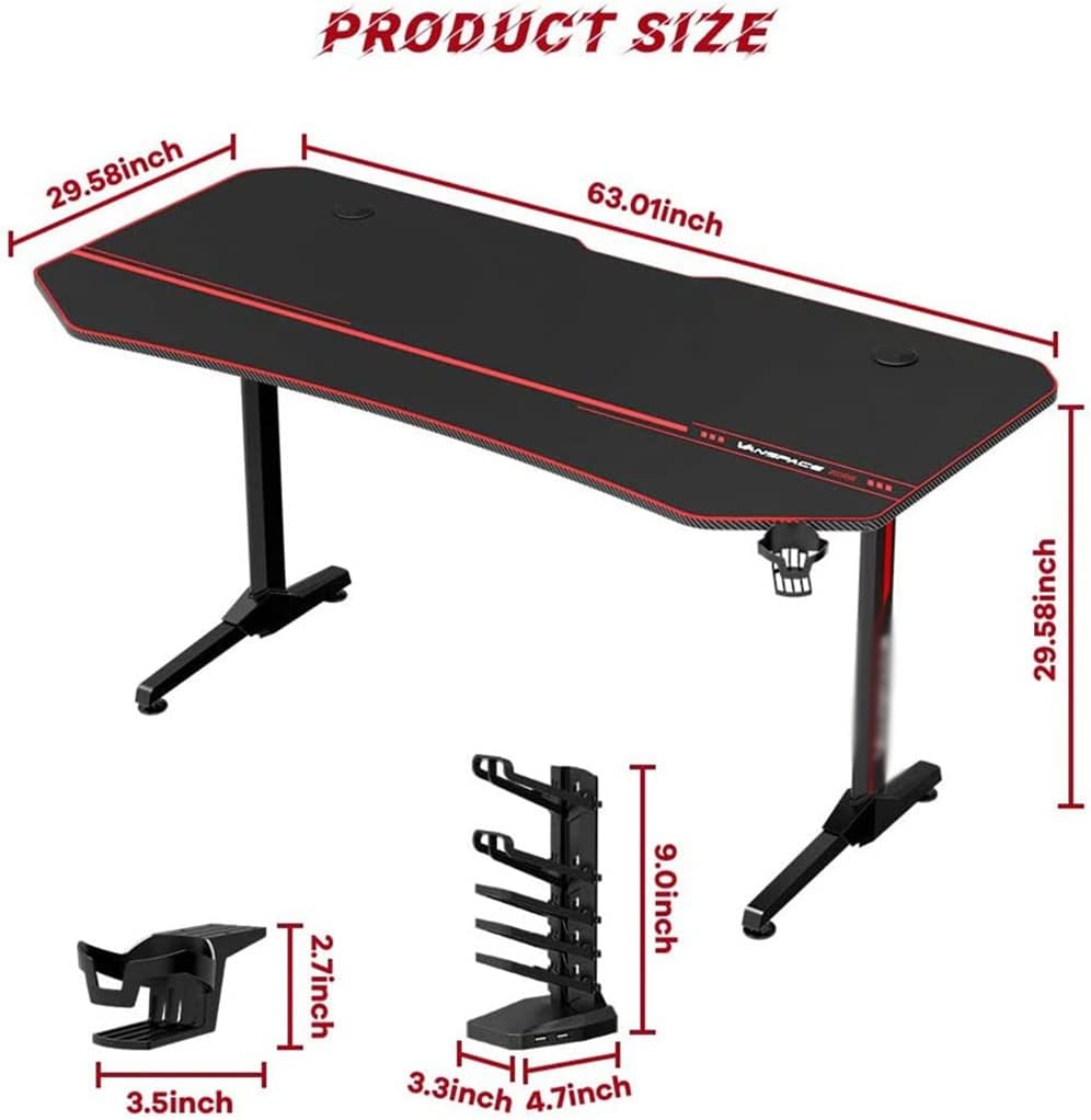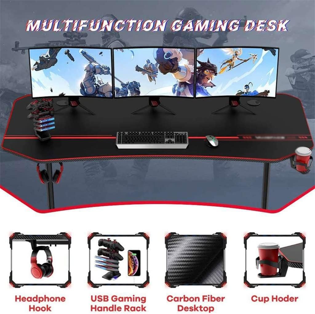 A large 63-inch gaming desktop that can hold up to 300 pounds, giving you plenty of room for all your gaming gear.You’ll have plenty of surface space for gaming, writing, computer work and other home office activities.The full-size non-slip gaming mouse pad effectively prevents the keyboard and mouse from sliding, protecting your desktop from scratches. So you can focus on that fight.The PVC carbon fiber surface is scratch resistant, easy to care for and clean.Comes with USB gamepad holder, cable manager, cup holder and headphone hook holder. Improve your gaming experience and keep your desktop organized.The sturdy metal frame and adjustable leg rests keep the table stable even on uneven floors. Make sure it’s sturdy and durable.Specification:Color: blackMaterial: Particleboard and MetalDimensions: 63.01″L×29.58″W×29.58″HDesktop Dimensions: 63.01″ L x 29.58″ WWeight: 60 lbsMaximum Capacity: 300 lbsPackage Included:1 x Office Gaming TableFoldable design helps you adjust the height with a comfortable angle