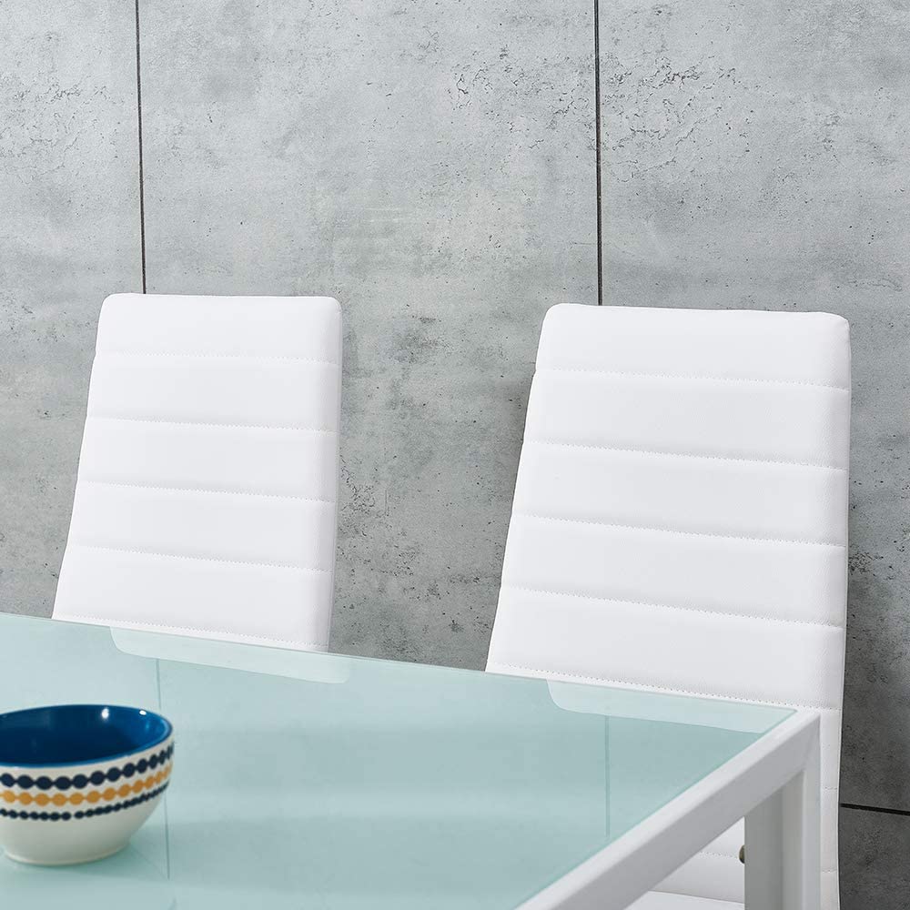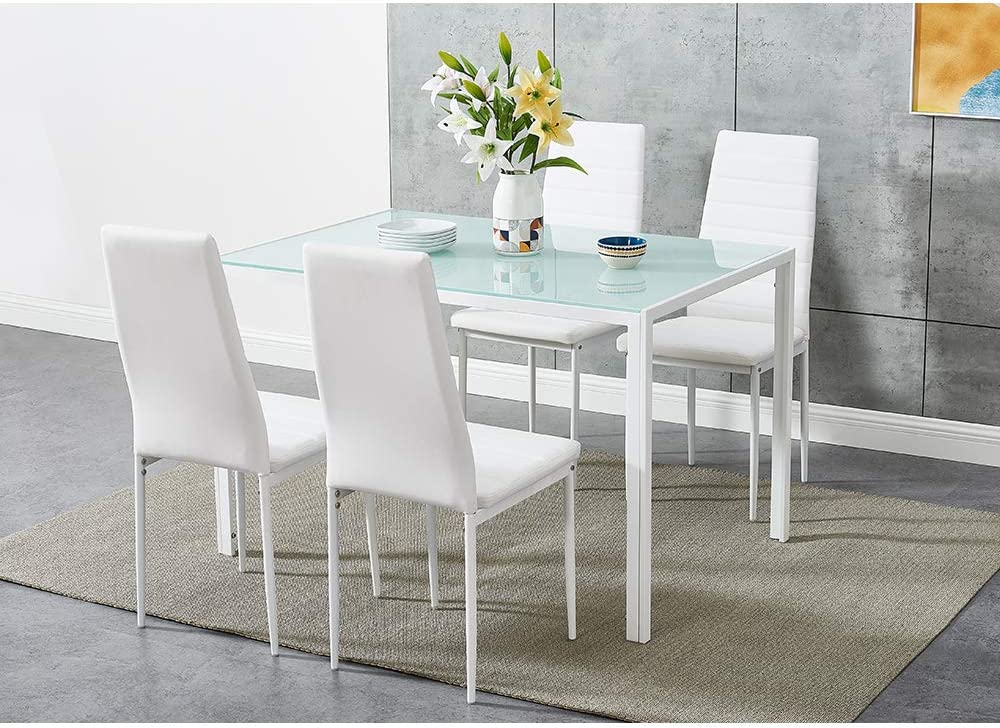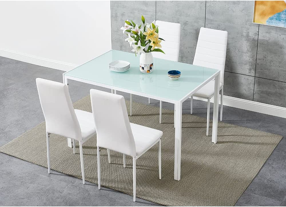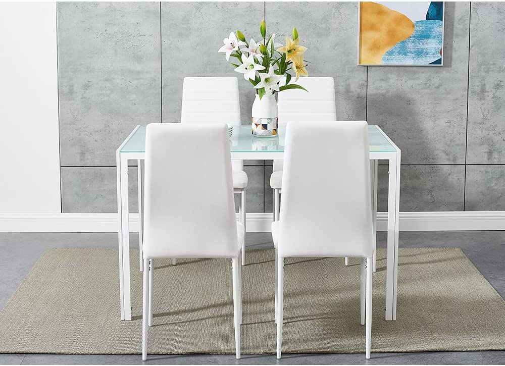 Panana 5Pcs Modern Dining Room Set Glass Dining Table and 4 Faux Leather Chairs Home Kitchen Furniture Set (White, 105cm Table and 4 chairs)