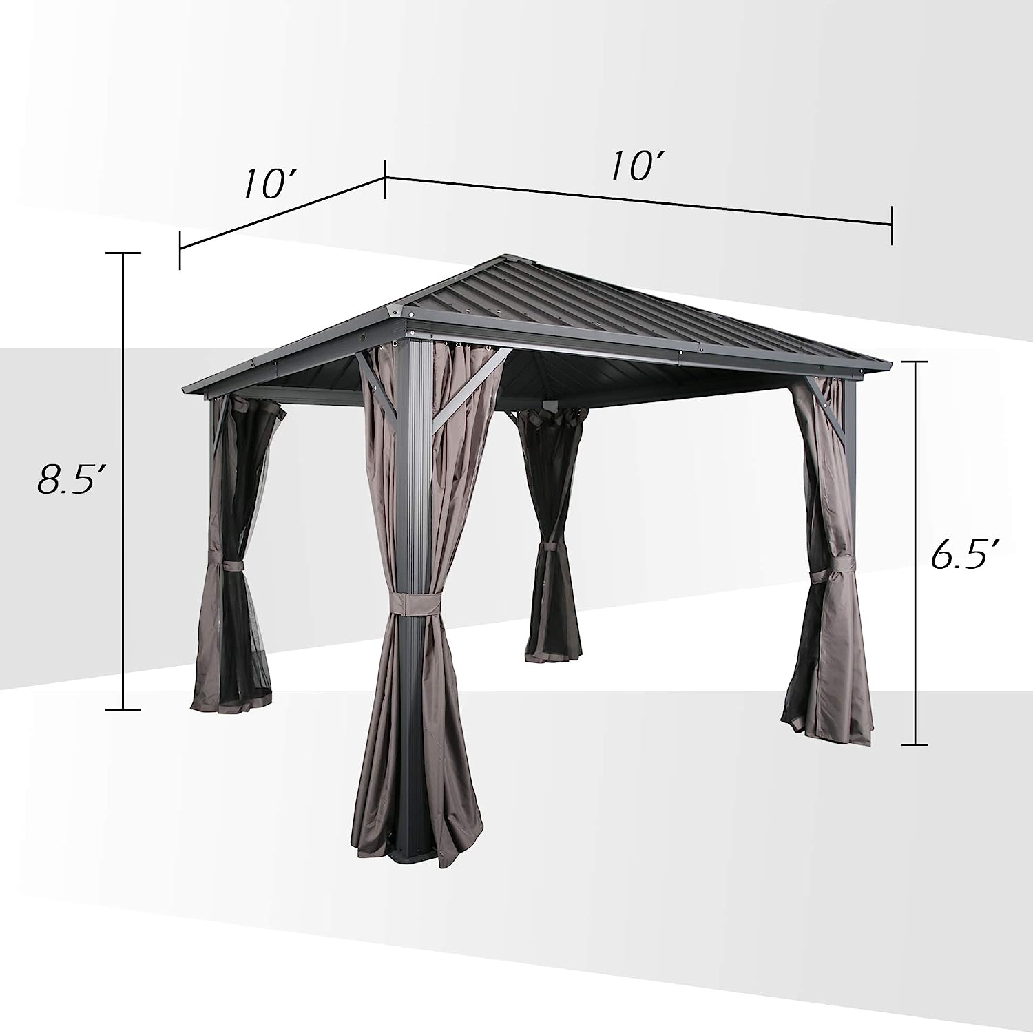 • Overall dimensions: 10’ (L) x 10’ (W) x 9.6’ (H). Assembly required.