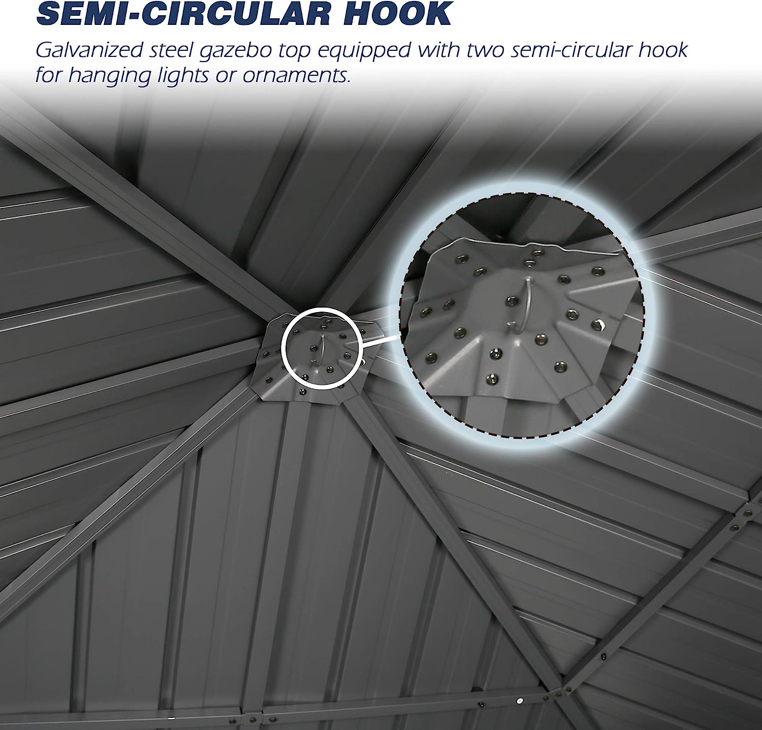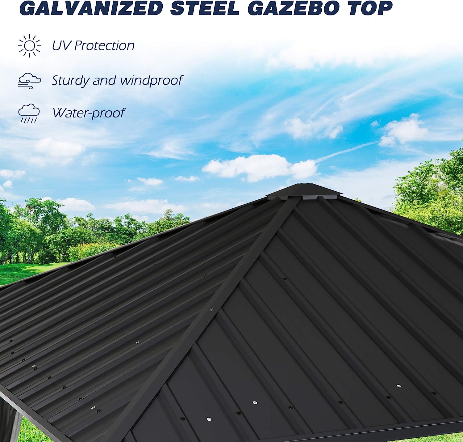 • The galvanized steel hard roof is strong enough to withstand extreme weather, such as heavy snow, hail, rain and winds, while providing better UV protection.