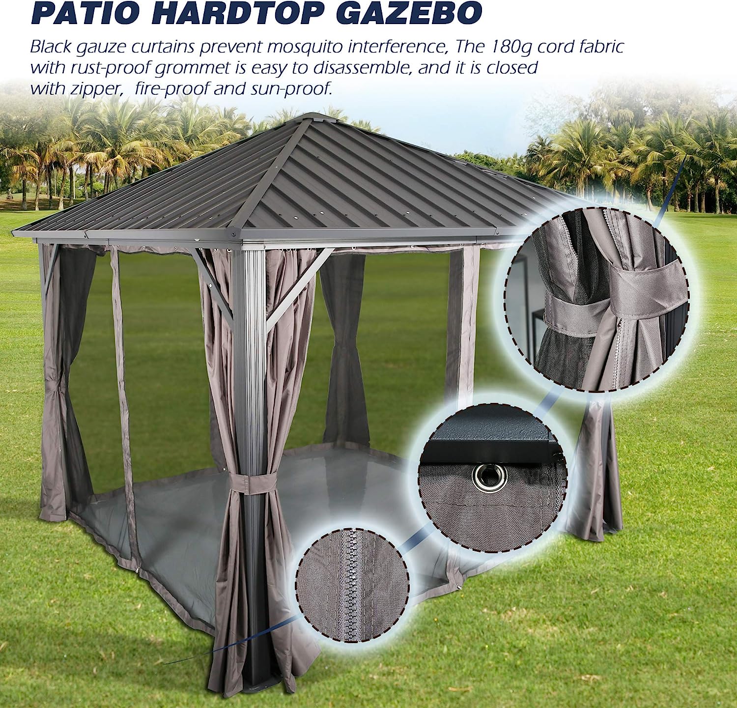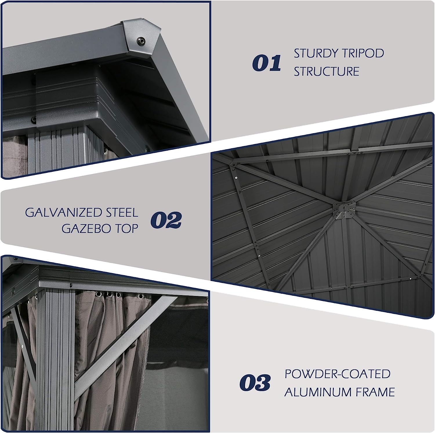 • Supported by a strong aluminum frame with powder coating finish, ensuring the gazebo will not rust and deformation.