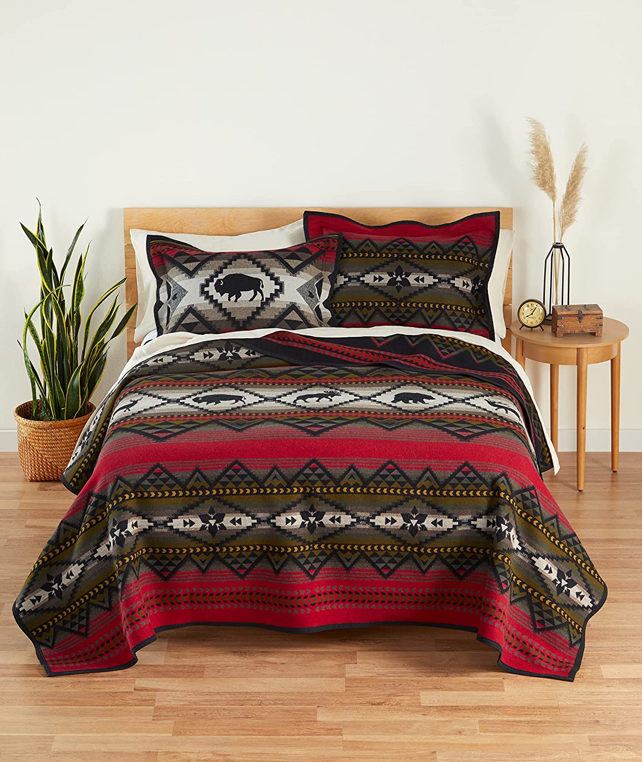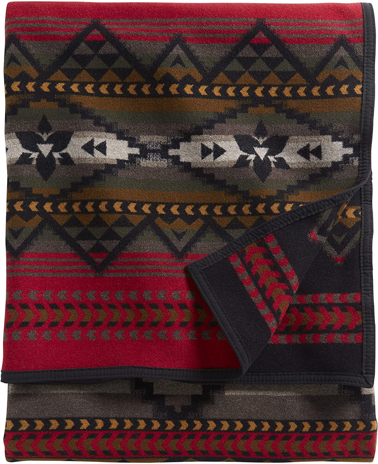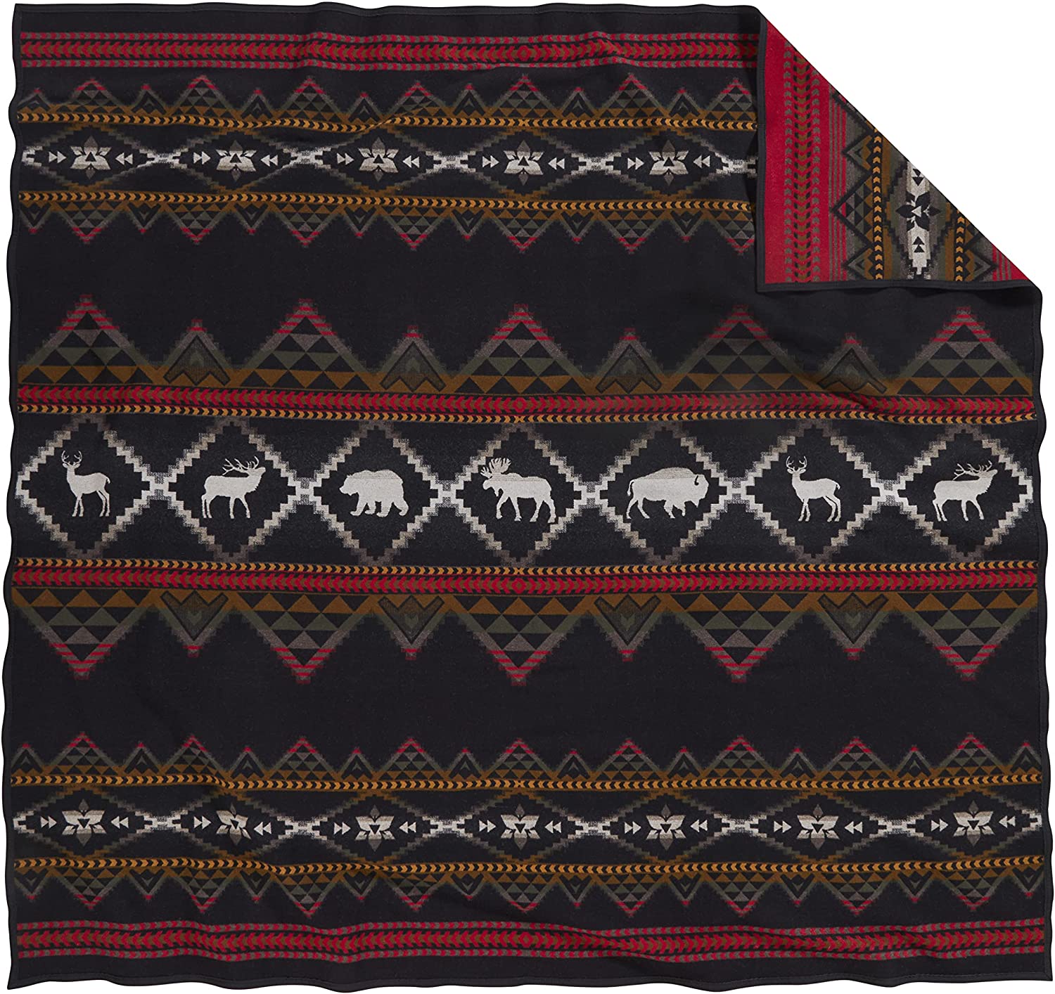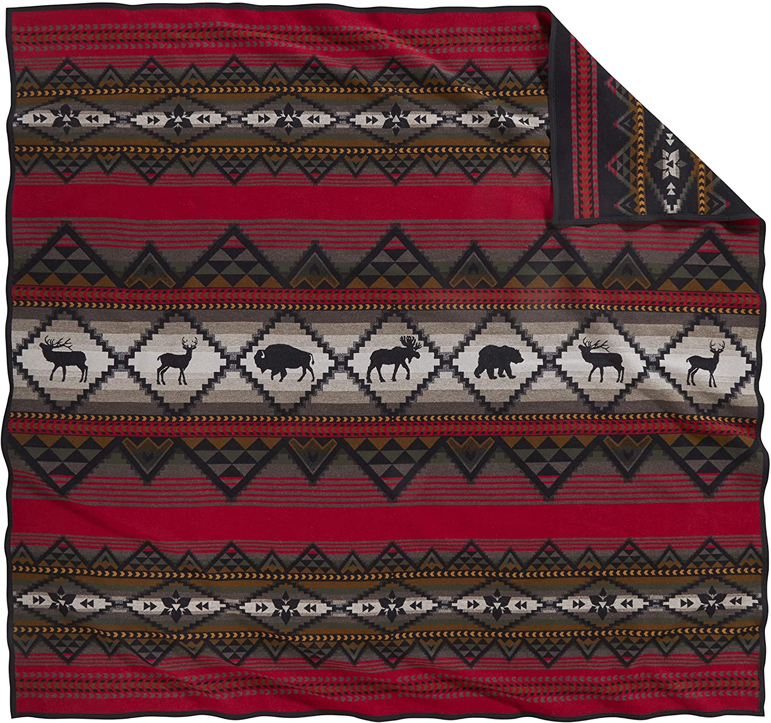 Lost Trail Pass crosses the border of Idaho and Montana, high in the Bitterroot Mountains. It was near here that the Lewis and Clark Corps of Discovery entered the Bitterroot Valley in September 1805, after successfully traversing the intense mountain terrain. In this USA-made wool blanket design, two peaked bands represent the Columbia River Drainage Basins divided by Lost Trail: Bitterroot Clark-Fork to the north, and Salmon to the south. The middle band showcases some of the wildlife that call the area home.