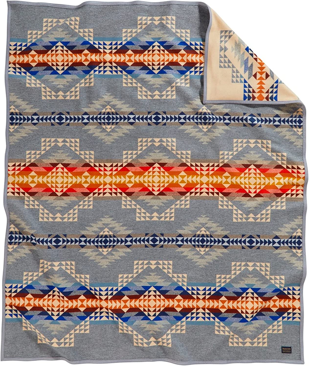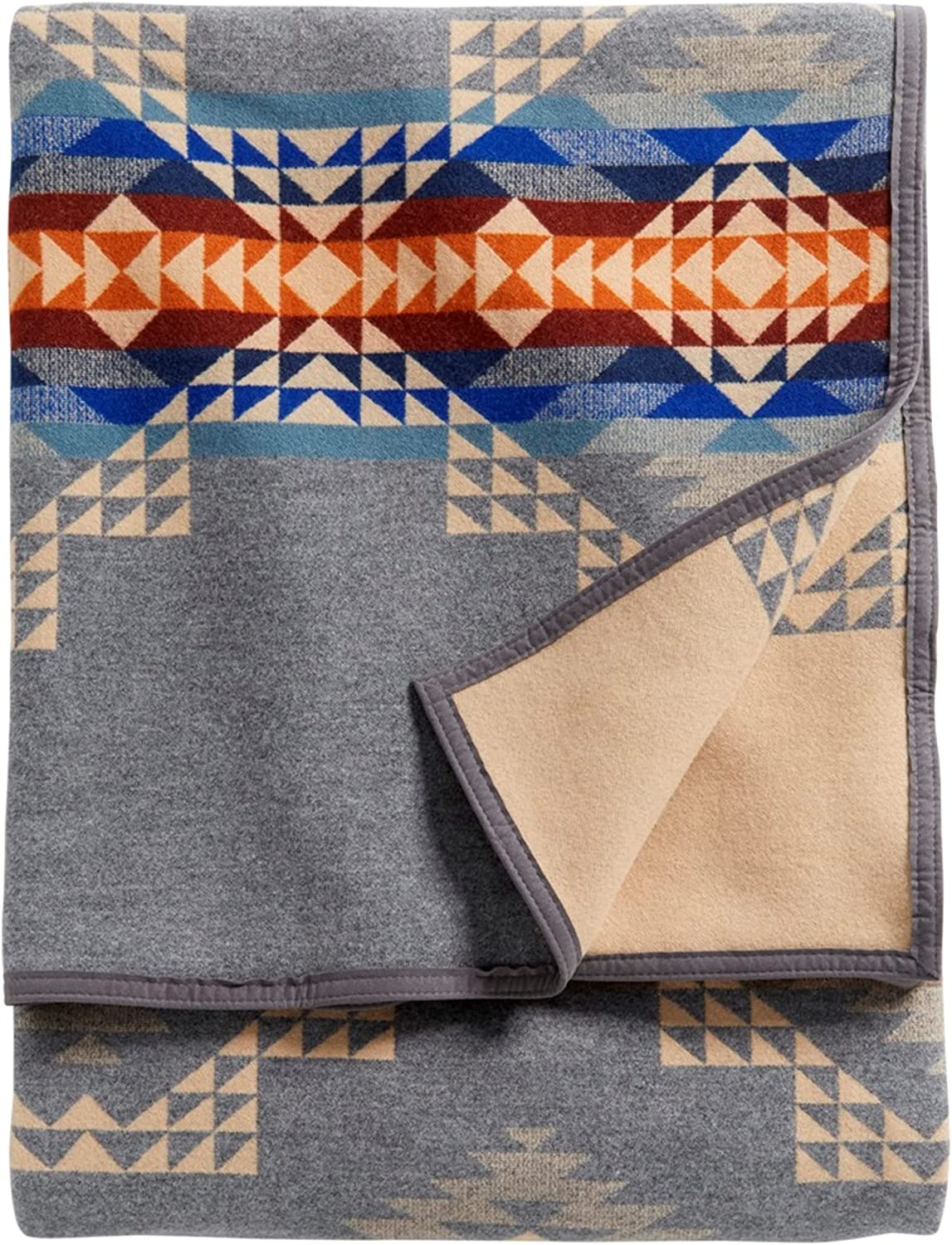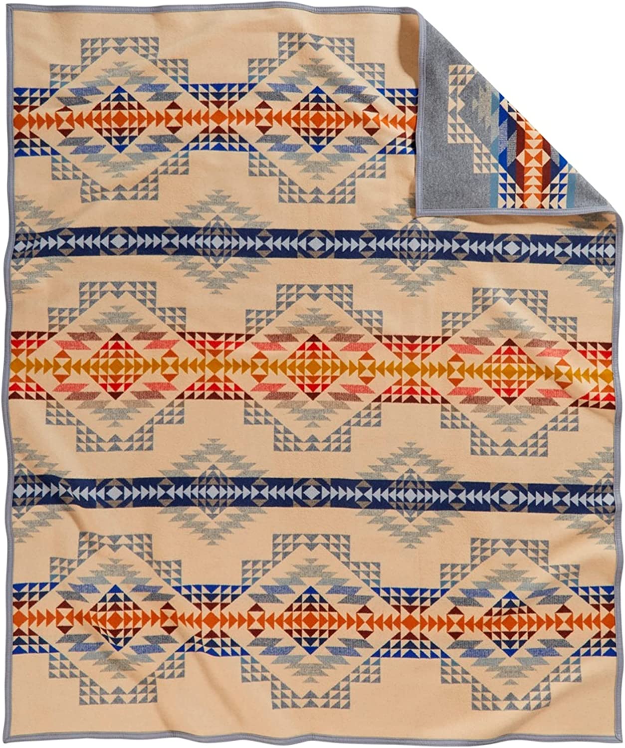 This wool blanket design echoes the towering rock face, geometric peaks, deep water canyons and hiking trails of Smith Rock State Park in Central Oregon—considered by many to be the birthplace of American sport climbing. Crafted to last a lifetime, this blanket is made just 200 miles away from Smith Rock, in our Pendleton, Oregon, mill. Reverses for two different looks. Twin is 64″ x 80″; Queen is 90″ x 90″; King is 90″ x 108″ Twin is napped; fabric is combed for a softer, thicker feel, with felt binding Queen and King are unnapped; fabric is uncombed for sharper pattern definition, with Ultrasuede binding 82% pure virgin wool/18% cotton Fabric woven in our American mills Dry clean Made in USA