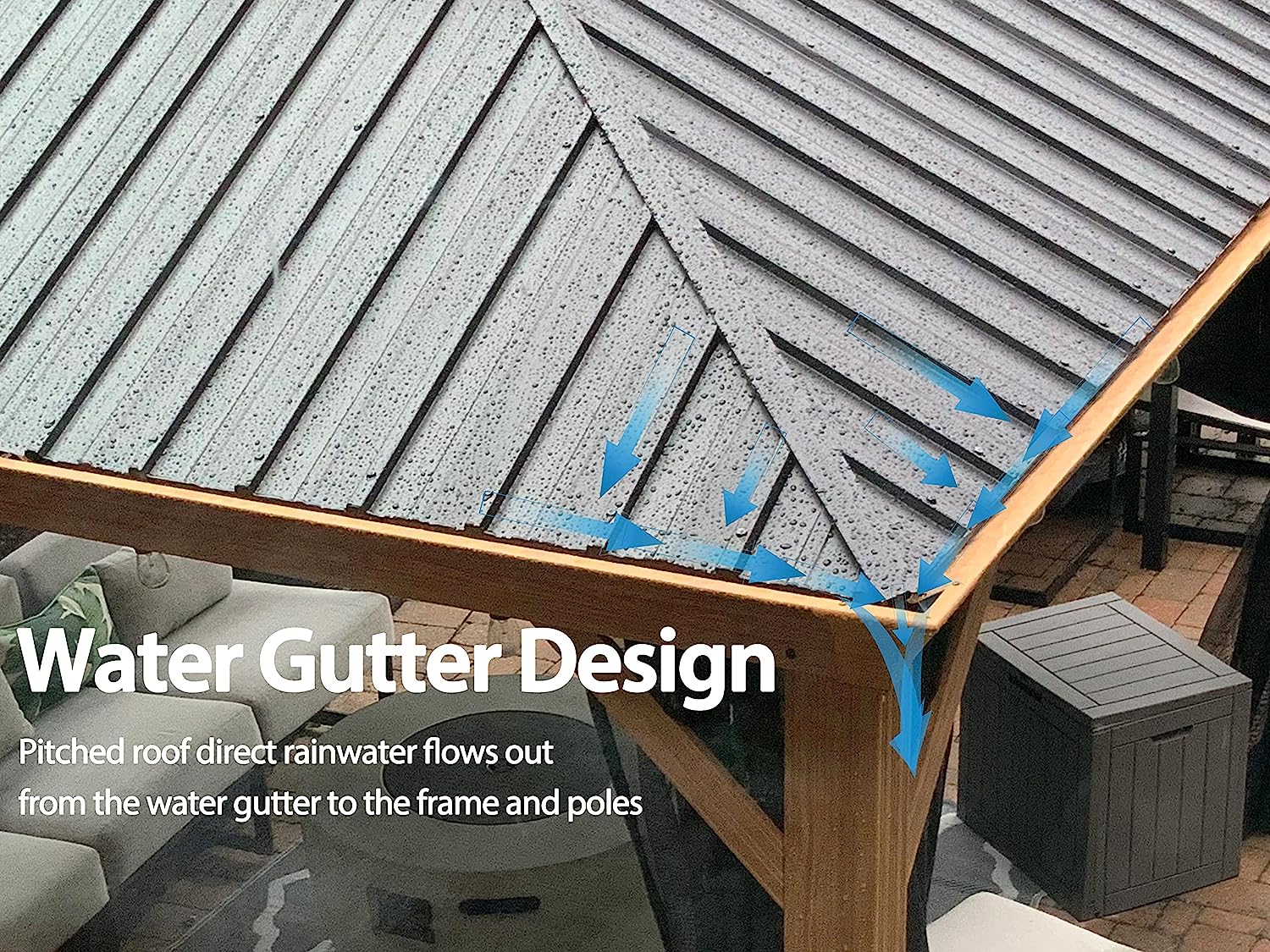 • Water gutter design ensures rainwater flows out of the edges of the frame and poles.