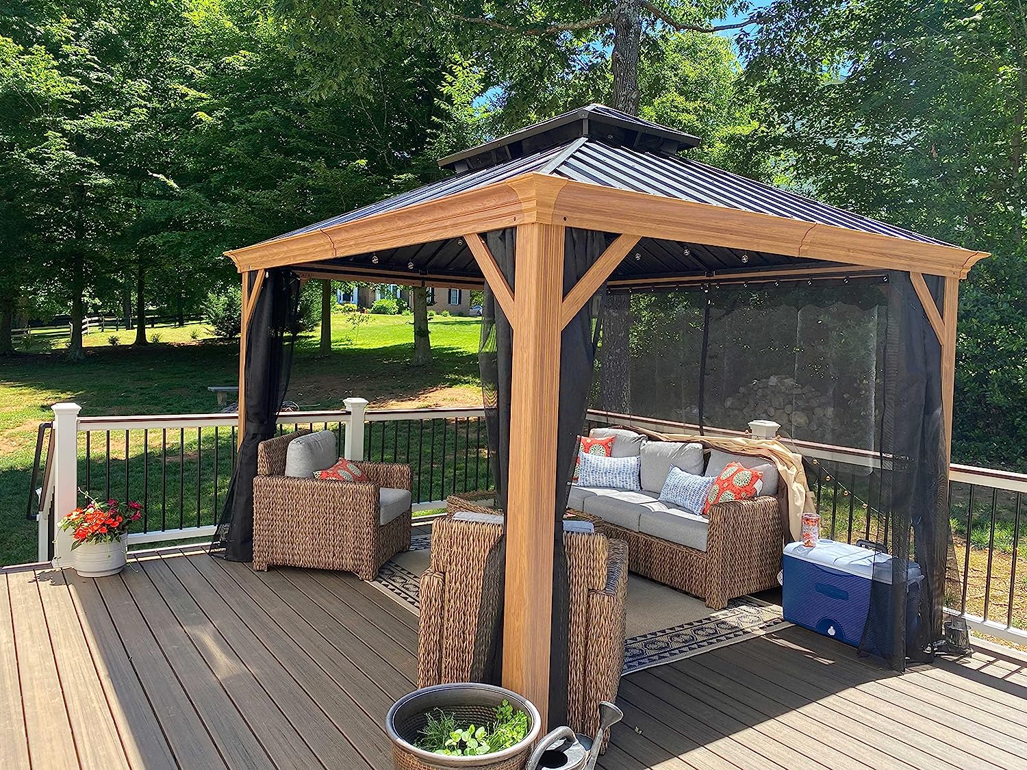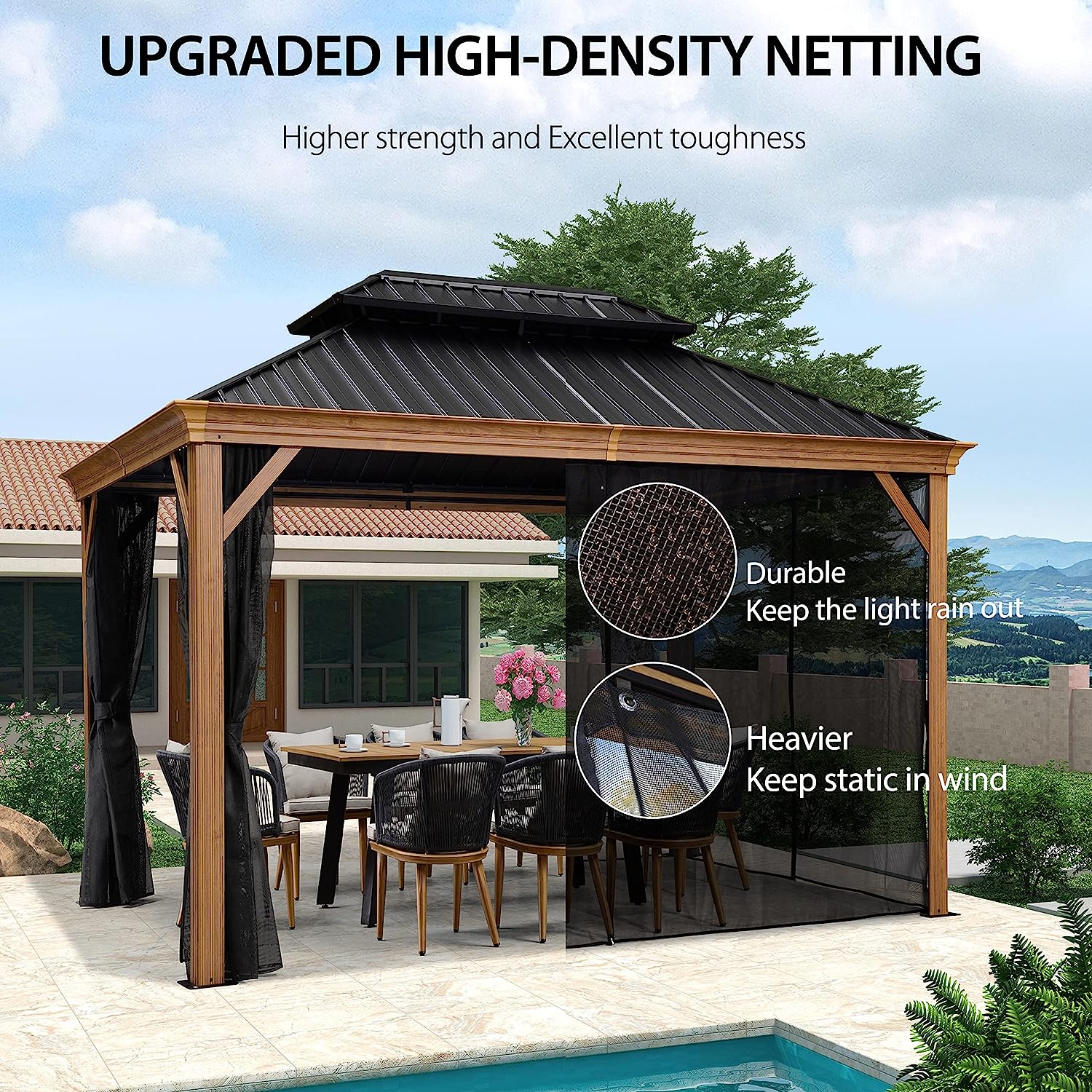 • Comes with the removable upgraded netting, more durable, keeps bugs out of the gazebo.