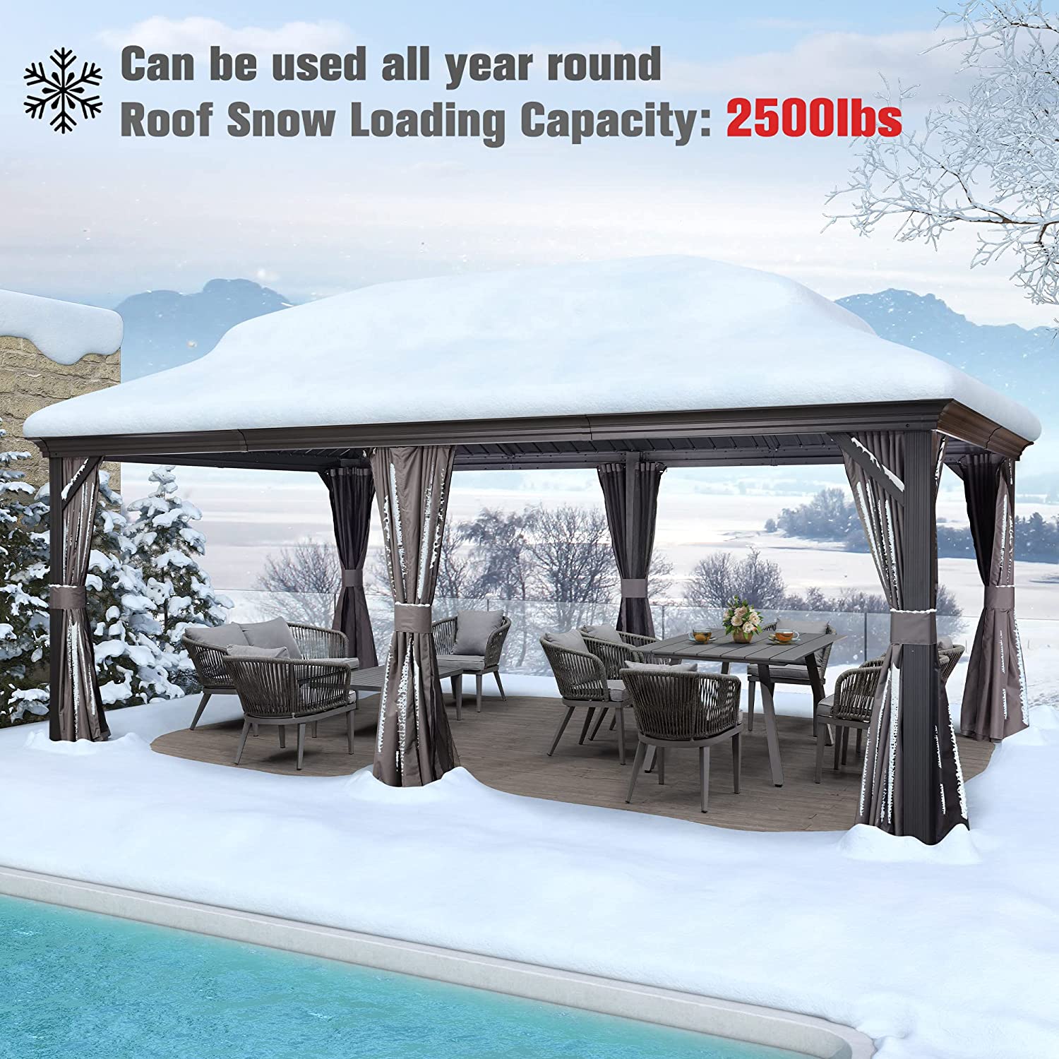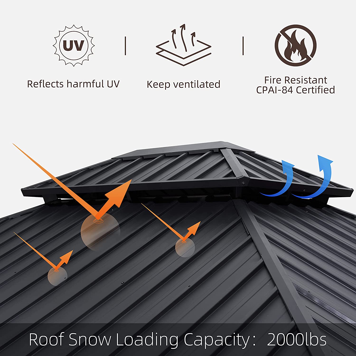 • Size: 12' X 20'. Fade-resistant and rust-resistant galvanized steel top, keeps out bright light and harmful UV rays, makes this hardtop gazebo strong enough to withhold heavy snow.