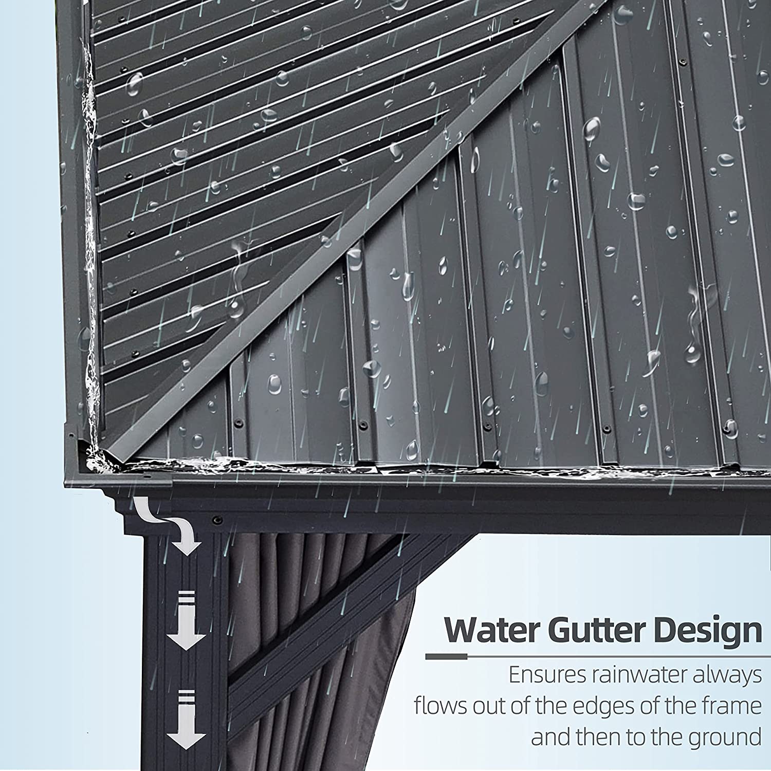 • Drainage System Design: Reasonably sloped roof designed to allow water to drain quickly, and the water gutter design ensures rainwater flows out of the edges of the frame and poles.