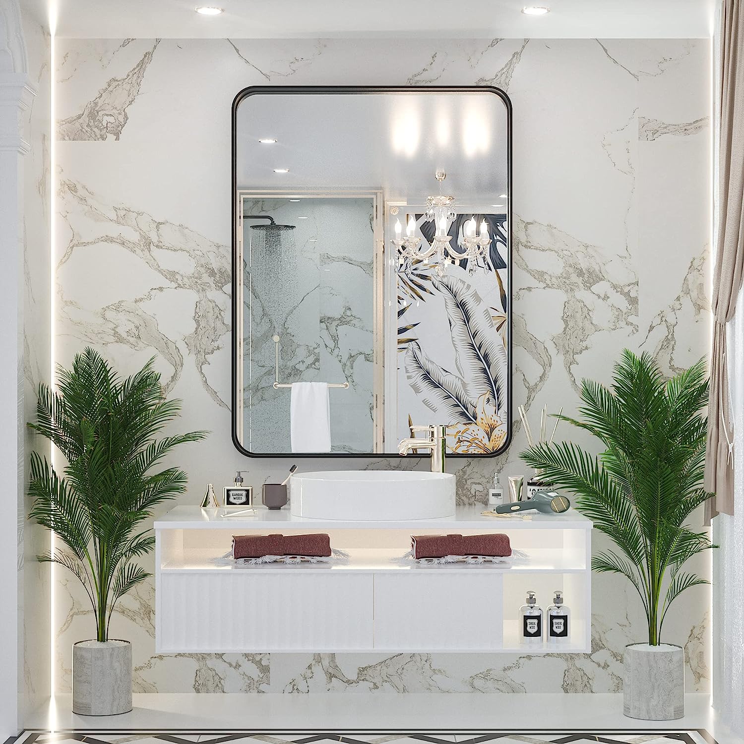 • ✨【5mm Shatterproof Glass】 A wonderful bathroom mirror is always combined with several craftwork layers. Excellent silver plated layer provides HD refection without any distortion on the wall mounted mirror. And shatterproof film is the important layer to keep people safe once the mirror is broken in accident