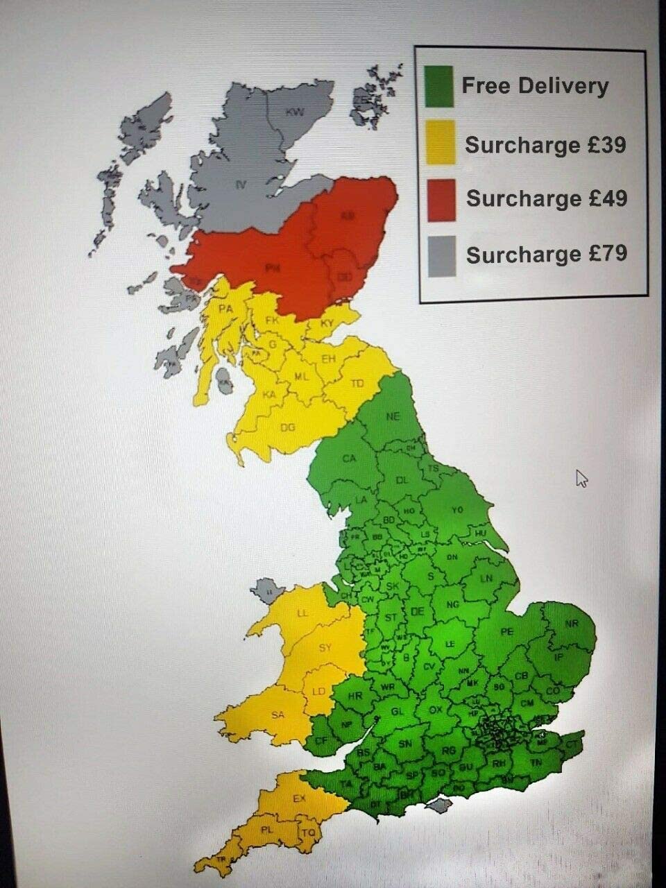 - WE DON'T DELIVER TO THE FOLLOWING POSTCODES · SCOTLAND (KW, IV, PH, PA, BT, AB) · TR, PL, TQ, EX, TA, DT and a few pieces of DG, LD and SA · ISLE OF MAN, N IRELAND and ISLE OF WIGHT