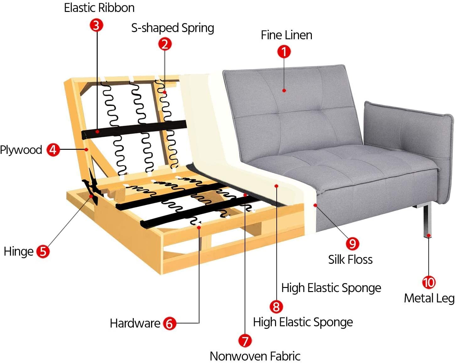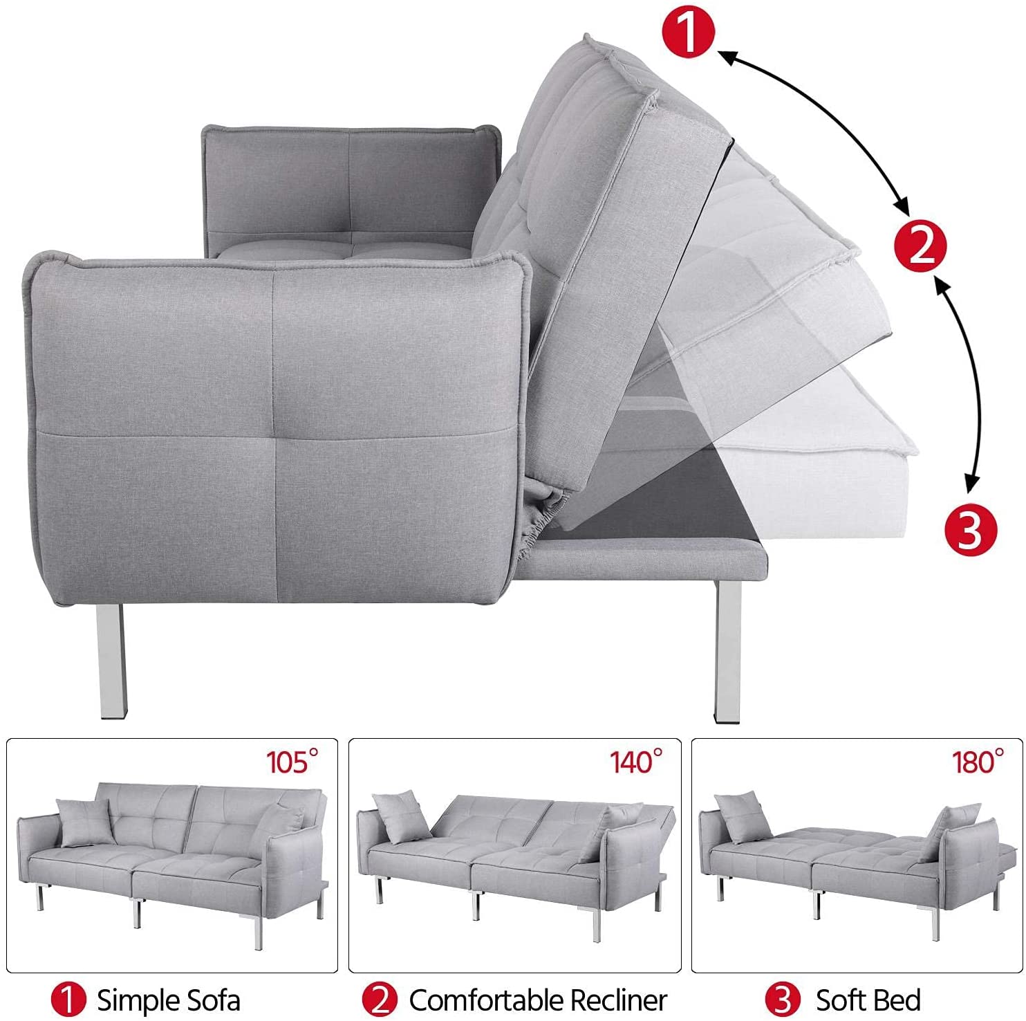 - Adjustable backrest design: The ergonomic living room futon bed is constructed of 3-position seat-to-backrest angle adjustment. A 105-degree angle provides your back a slightly reclined position healthy to your back on regular basis. A 140-degree reclining position might put the least stress on the spine and help reduce the risk of back pain. 180-degree flat lying makes occasional couch sleeping commodious. You can always adjust it to the most comfortable angle as you need.