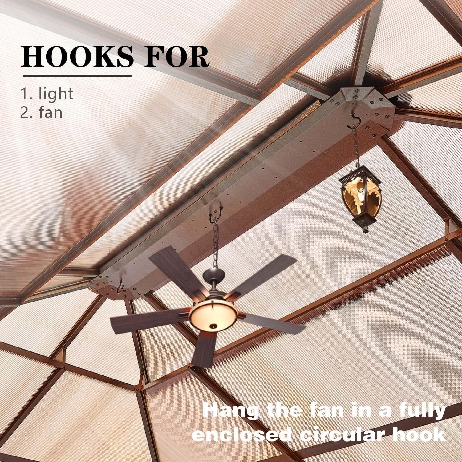 - 𝗗𝗢𝗨𝗕𝗟𝗘 𝗧𝗢𝗣 𝗗𝗘𝗦𝗜𝗚𝗡: For fuller protection and fresher air, our patio gazebo features a ventilated, double-layer polycarbonate roof. It prevents harmful UV rays while allowing air circulation and helps withstand wind. *Please note that the polycarbonate roof can only block UV rays, not high temperature and strong light.