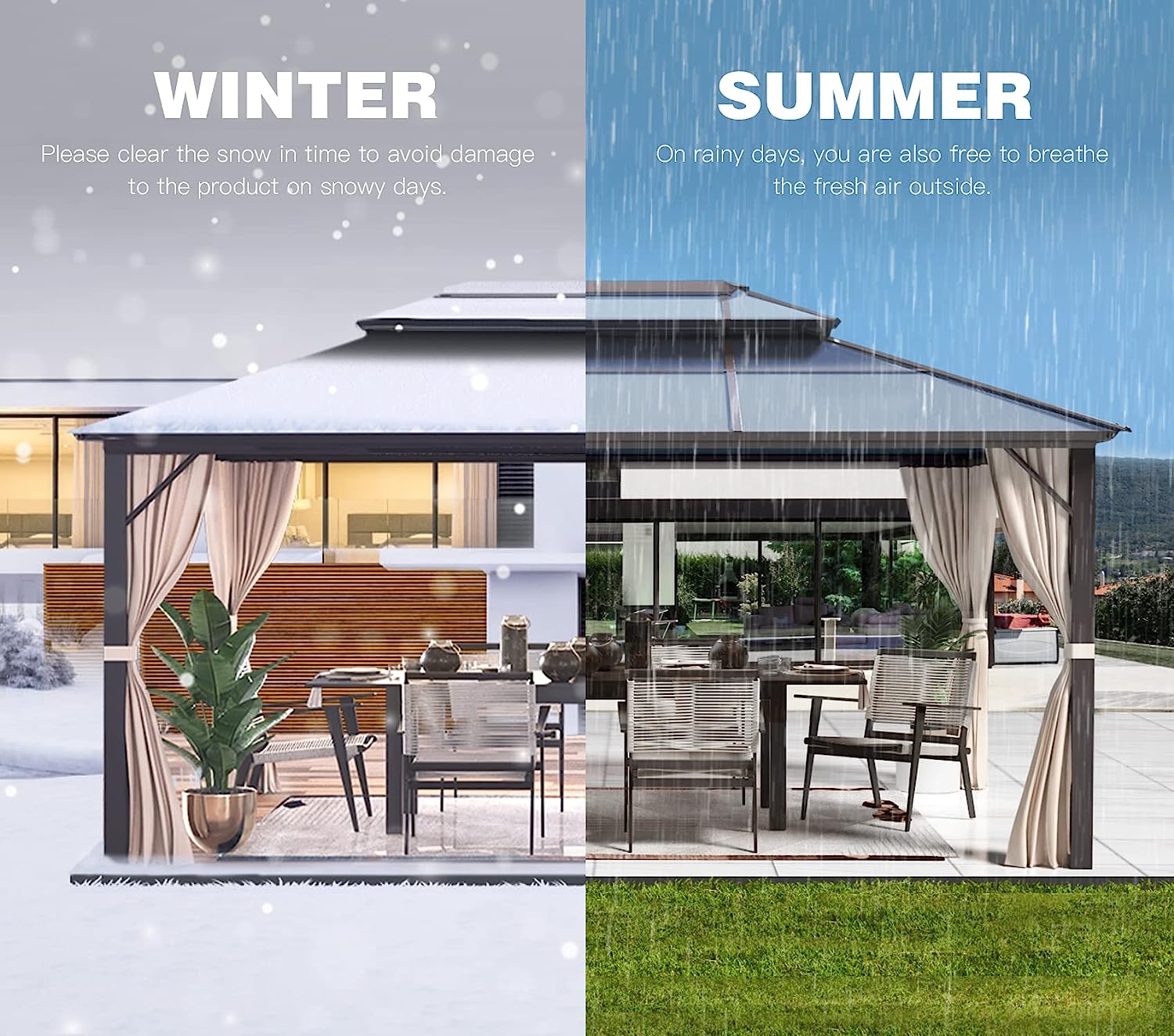 - 𝗜𝗡𝗖𝗟𝗨𝗗𝗘 𝗠𝗘𝗦𝗛 𝗖𝗨𝗥𝗧𝗔𝗜𝗡𝗦 & 𝗣𝗥𝗜𝗩𝗔𝗖𝗬 𝗖𝗨𝗥𝗧𝗔𝗜𝗡𝗦: The hardtop gazebo comes with a double-track system for easy sliding. Removable curtains ensure UV and rain protection, while the equipped mesh curtain with zipper keeps good ventilation. Let you enjoy great privacy while having full airflow and a wide view of the outdoors.