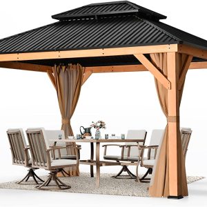 HAPPATIO 11' × 13' Wood Gazebo, Outdoor Hardtop Gazebo with Mosquito Netting and Curtains, Double Metal Roof Patio Gazebo Hard Top Gazebo for Garden, Patio, Deck, Parties (Brown)