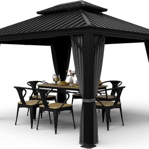 HAPPATIO 10'x 12' Hardtop Gazebo, Outdoor Polycarbonate Double Roof Aluminum Furniture Gazebo Canopy with Netting and Curtains for Backyard, Deck, Patio (Brown)