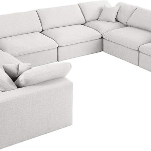 Meridian Furniture Serene Collection Modern | Contemporary Deluxe Cloud-Like Comfort Modular Sectional, Soft Linen Textured Fabric, Down Cushions, 4 Corner + 4 Armless, Cream