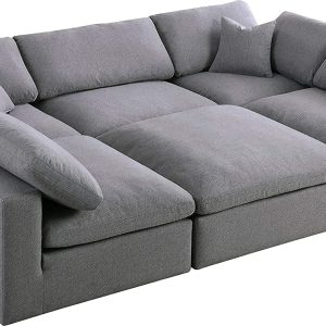 Meridian Furniture Serene Collection Modern | Contemporary Deluxe Cloud-Like Comfort Modular Sectional, Soft Linen Textured Fabric, Down Cushions, 2 Corner + 3 Armless + 1 Ottoman, Grey