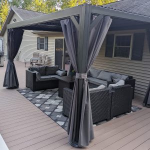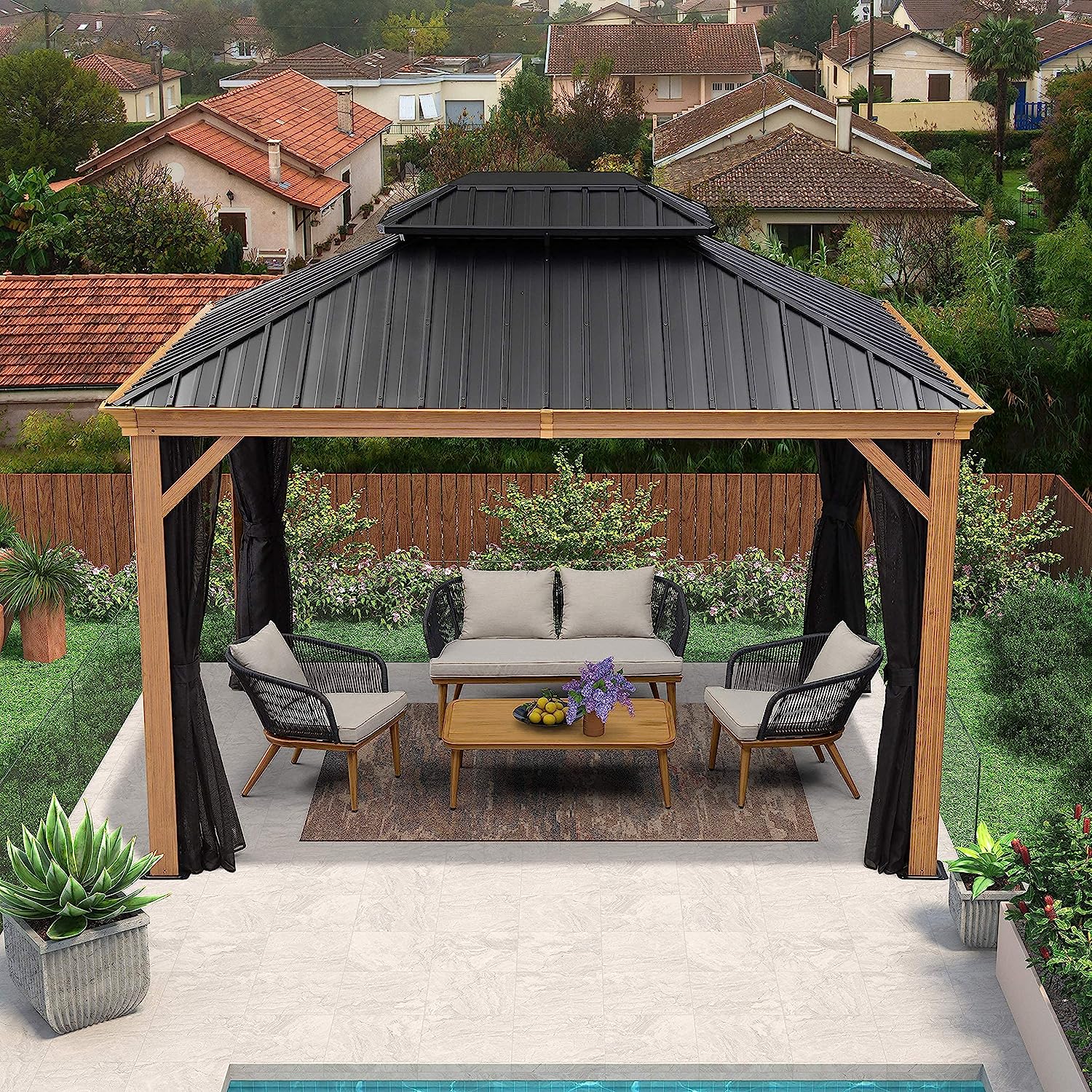 PURPLE LEAF 10' X 12' Outdoor Hardtop Gazebo for Patio Galvanized Steel Double Roof Permanent Canopy Teak Finish Coated Aluminum Frame Pavilion Gazebo with Netting