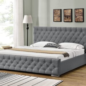 Athens Buttoned Gas Lift Ottoman Storage Bed Frame Chrome Feet Single, Double, King Silver, Oyster, Light and Dark Grey, Black Mink Fabrics Crushed Velvet Chenille or Linen (Linen Dark Grey, Double)