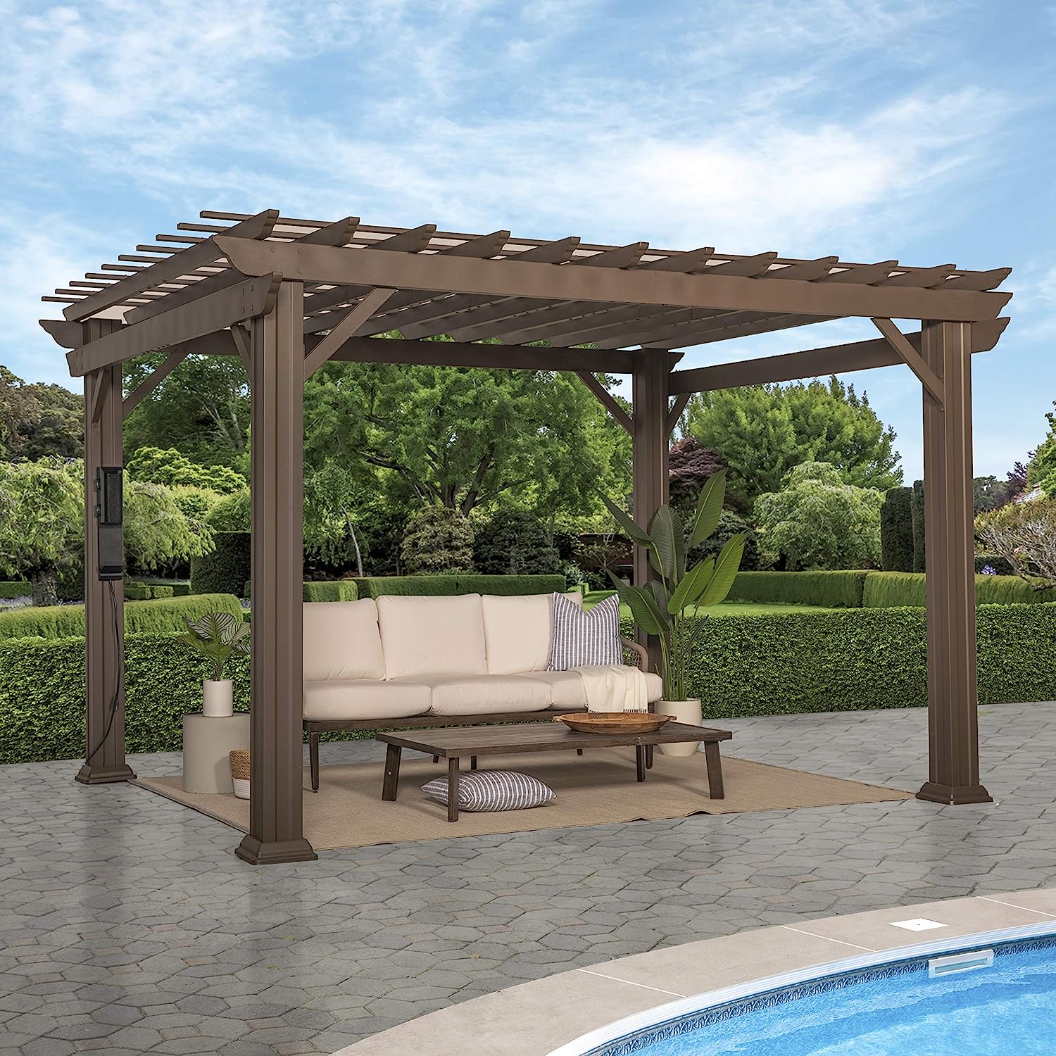 Backyard Discovery 12×10 Ashford Brown Galvanized Steel Traditional Pergola w/Sail Soft Shade Canopy, Rust Resistant, Resist Wind Speeds Up to 100 MPH, Heavy Duty, Powerport USB and Electrical Outlet
