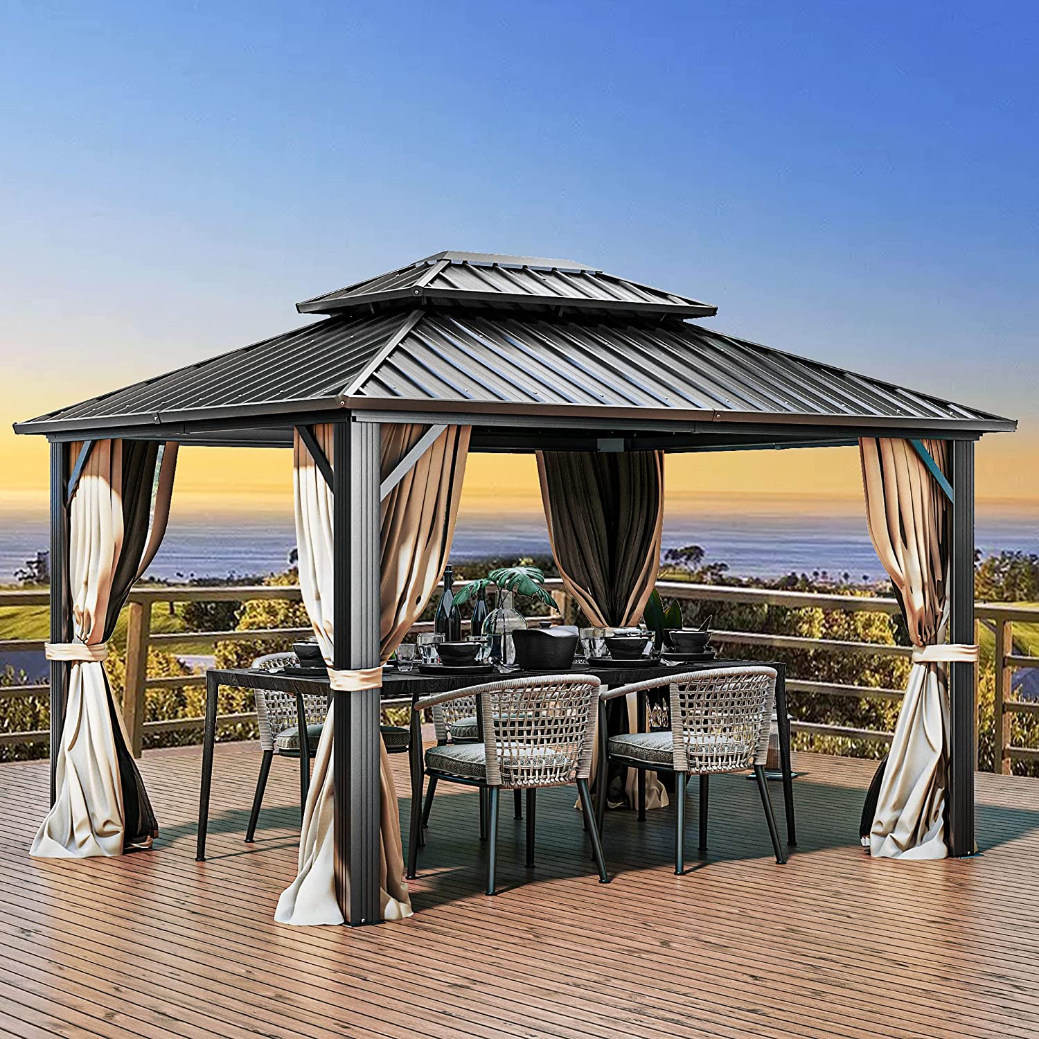 YITAHOME 10×12 ft Gazebo Double Roof Canopy with Netting and Shaded Curtains, Outdoor Gazebo 2-Tier Hardtop Galvanized Iron Aluminum Frame Garden Tent for Patio, Backyard, Deck and Lawns